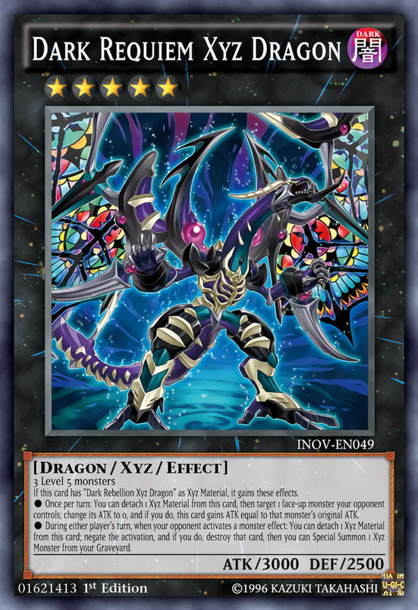 - Dark Rebelion Xyz Dragon với Dark Requiem Xyz Dragon là combo khá hiệu quả giúp người chơi vừa OTK và kiểm soát trận đấu bằng hiệu ứng của Dark Requiem Xyz Dragon cho phép người chơi vô hiệu hóa 1 hiệu ứng quái thú mà đối thủ vừa kích hoạt bằng cách tách 1 nguyên liệu từ nó, sau đó người sử dụng có thể triệu hồi đặc biệt 1 quái thú Xyz dưới mộ, và đặc biệt ở chỗ khả năng này không bị giới hạn số lần sử dụng trong lượt. Các bài thủ hoàn toàn có thể lên Dark Requiem Xyz Dragon bằng Phantom Knight’s Rank-Up-Magic Force.