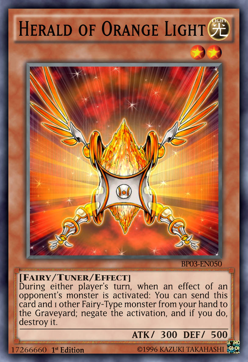 Tất nhiên, nhìn lại thì rõ ràng Herald of Orange Light về cơ bản là một lá bài mạnh. Herald of Perfection lần đầu tiên đã biến Orange Light thành một mối đe dọa thực sự và sau đó nó đã tìm được cách kết hợp với các chiến thuật Fairy khác như Agents, Cyber Angel, và Drytron. Sau khi giành một khoảng thời gian trong danh sách Limited, bắt đầu được thả dần về 2 và cuối cùng là 3 như hiện tại. Drytron có thể không còn sử dụng lá bài này, nhưng các bộ bài thuộc tộc Fairy có thể sẽ biến Herald of Orange Light trở thành mối đe dọa thêm một lần nữa.