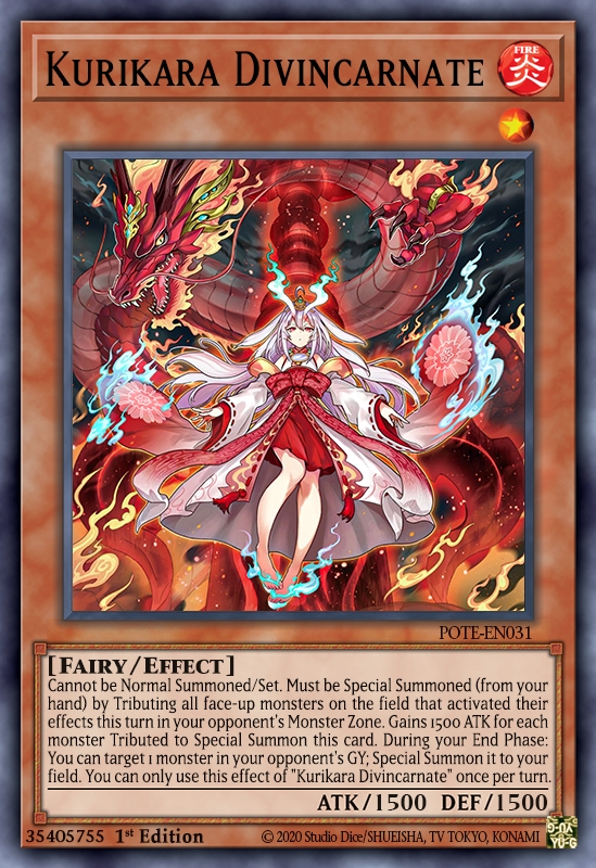 Kurikara Là một trong những lá bài Phá bàn với hiệu ứng hiến tế quái thú của đối thủ để triệu hồi nó lên sân, nhưng yêu cầu điều kiện: những quái thú đó cần phải kích hoạt hiệu ứng của mình trong lượt triệu hồi đó. Đó cũng chính là lí do nhiều người chơi không đánh giá quá cao lá bài này, thay vào đó là Kaiju, Sphere Mode hay Lava Golem có thể sử dụng đơn giản hơn rất nhiều. Nhưng trong thời gian vừa qua Kurikara Divincarnate đã chứng minh được sức mạnh tuyệt vời của mình, khi được sử dụng một cách rộng rãi trong Side-deck để đối đầu với bộ bài Kashtira, bộ bài thống trị meta trong một khoảng thời gian dài. Cách đây vài năm trước bạn chỉ cần bỏ ra chưa đến 10$ cho một copy nhưng bây giờ giá trị đã lên gấp 5 lần.