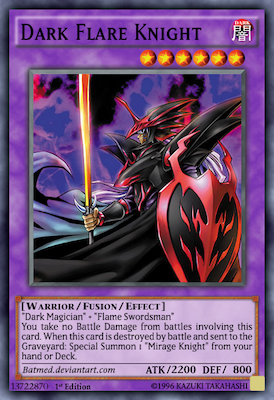Dark Magician có sức tấn công là 2500, còn sức tấn công của Flame Swordsman là 1800. Bài thủ chắc hẳn sẽ mong đợi phiên bản Dung hợp của chúng sẽ mạnh hơn so với 2 quái thú gốc. Quái thú Dung hợp đó là Dark Flare Knight, không chỉ không có sức tấn công tổng của 2 quái thú ban đầu là 4300, mà nó thậm chí còn thấp hơn 300 so với sức tấn công của Dark Magician.