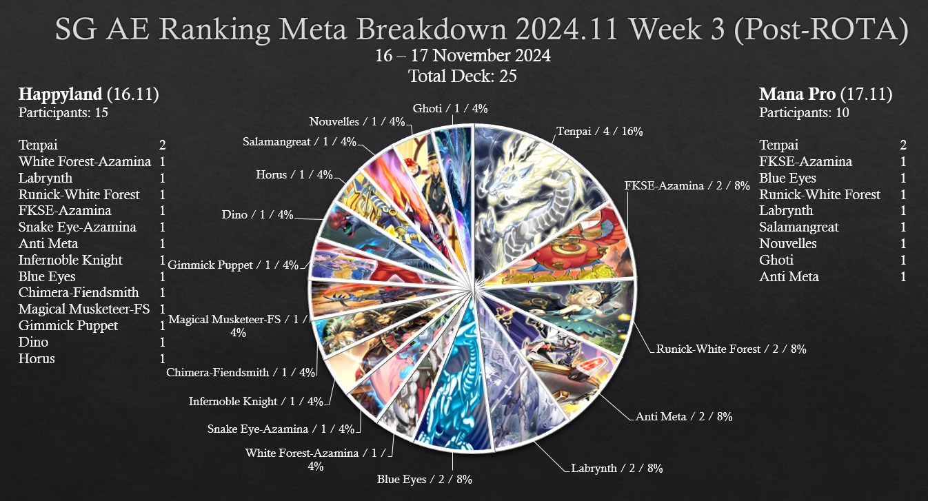 Mặc dù lượng card pool liên tục được bổ sung, tạo điều kiện cho các bài thủ dần bắt kịp metagame hiện tại (chậm khoảng 1-2 format so với OCG, nhưng vẫn là thần tốc bởi các booster đầu tiên như CR01, DUNE chỉ mới ra mắt cách đây 1 năm), người chơi format AE vẫn phải thi đấu dưới banlist rất cũ là banlist Tháng 11/2023. Thời điểm ra mắt banlist này, lượng card pool còn quá nghèo nàn, nên chỉ có thể đưa vào danh sách Cấm những lá bài quá mạnh từ hàng chục năm trước. Do đó, trong cả năm 2024 các meta lần lượt ra mắt như Snake-Eye, Tenpai, Stun,... đều thỏa sức tung hoành mà không gặp bất cứ rào cản sức mạnh nào, về cả engine và non-engine. Với lực lượng đáng sợ như vậy, không khó để những bộ bài này tạo ra khoảng cách xa với các Deck rogue khác. Rõ ràng một banlist phù hợp là điều rất cần thiết lúc này, không chỉ giới hạn sức mạnh các meta cũ, mở đường cho meta từ các sản phẩm mới mà còn “phong sát” các staple đang được thả 3, đưa format tiệm cận với OCG, TCG hiện tại.