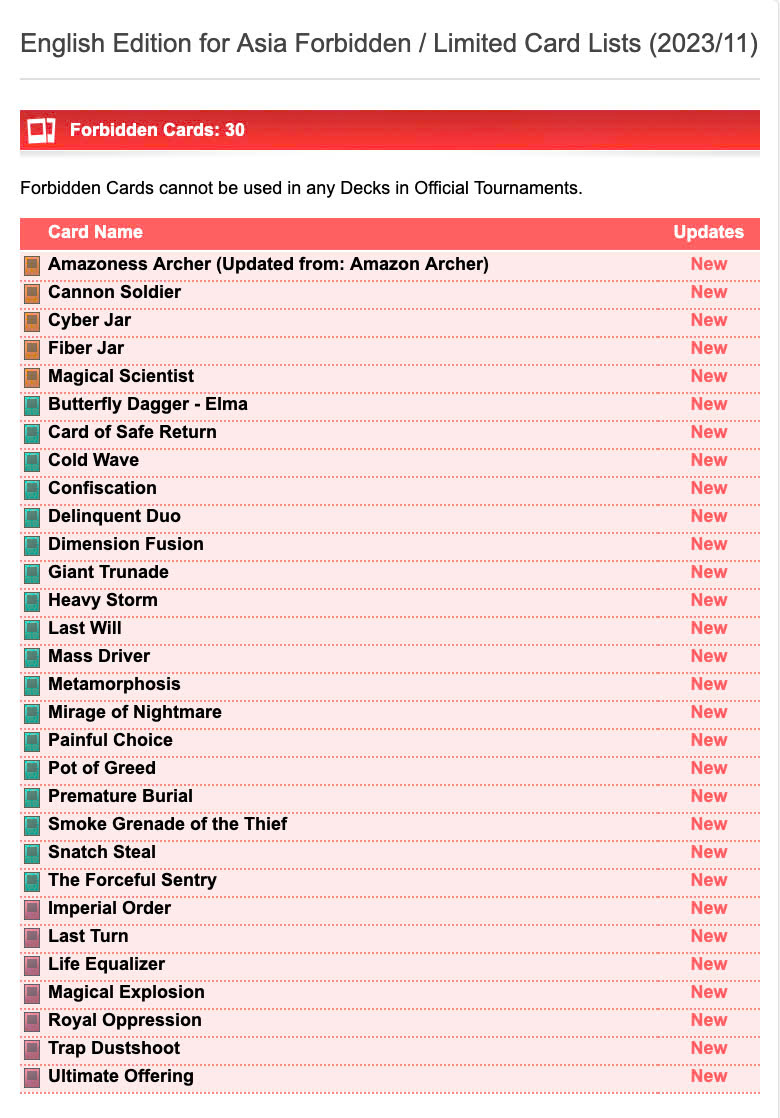 Đúng như dự đoán, tất cả staple quá mạnh trong mọi Deck như Harpie's Feather Duster, Foolish Burial, Terraforming, One For One, Monster Reborn, ROTA, Red Reboot, Called by the Grave, Crossout Designator,... đều trở về vị trí xứng đáng, Limited hoặc Semi-Limited. Đây là nút thắt quan trọng nhất, thể hiện format đang đi đúng hướng. Sẽ không còn cảnh x3 Duster, Red Reboot huỷ diệt Deck Trap, hay x3 Chỉ tay Chỉ kiếm full combo nữa. Format trở nên cân bằng hơn rất nhiều, người chơi sẽ cần chú trọng việc build Deck nhiều hơn.