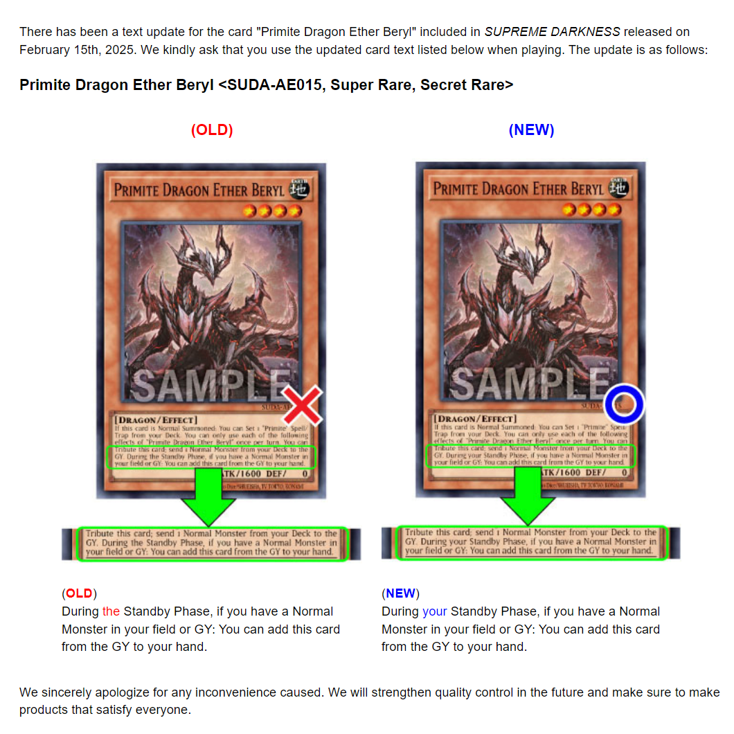 Ngoài các trường hợp trên, còn một lá bài nữa cũng từng có text AE khác JP là Primite Dragon Ether Beryl, nhưng đã được errata và update trên Yu-Gi-Oh! Neuron.