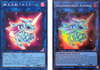 Tương tự Mausoleum of the Emperor, theo JP thì "通常召喚/Normal Summon" bao gồm cả Normal Summoning và Set, tuy nhiên theo AE thì chỉ tính Normal Summon thôi. Do đó Salamangreat Almiraj không thể dùng quái thú được Set sau đó flip làm nguyên liệu.