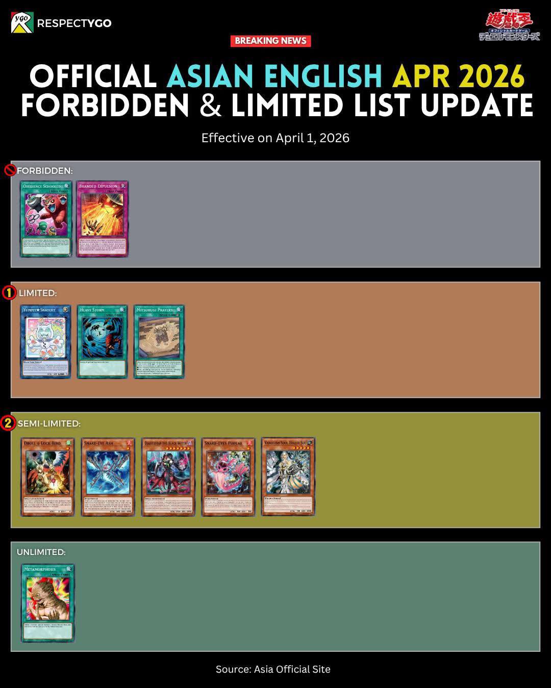 Banlist AE tháng 04/2026 đã xuất hiện bất ngờ, mang theo hàng loạt thay đổi lớn và tác động mạnh mẽ đến cục diện meta. Tâm điểm của đợt điều chỉnh này chính là đòn giáng cực nặng vào Yummy - bộ bài đã thống trị suốt nhiều tháng qua. Khi Obedience Schooled, starter quan trọng của deck, chính thức bị đưa vào danh sách cấm. Chưa dừng lại ở đó, Yummy★Snatchy - quái thú Link chủ lực cũng bị giới hạn xuống chỉ còn 1, khiến trần sức mạnh và khả năng grind của deck bị suy giảm rõ rệt. Những thay đổi này cho thấy quyết tâm rất rõ ràng từ Konami trong việc chấm dứt thời kỳ thống trị của Yummy.bỞ chiều ngược lại, Vanquish Soul chỉ chịu một điều chỉnh tương đối nhẹ khi Vanquish Soul Hollie Sue bị đưa xuống mức semi-limited. Nhiều khả năng deck vẫn sẽ giữ được sự ổn định vốn có, tiếp tục góp mặt trong nhóm cạnh tranh hàng đầu.