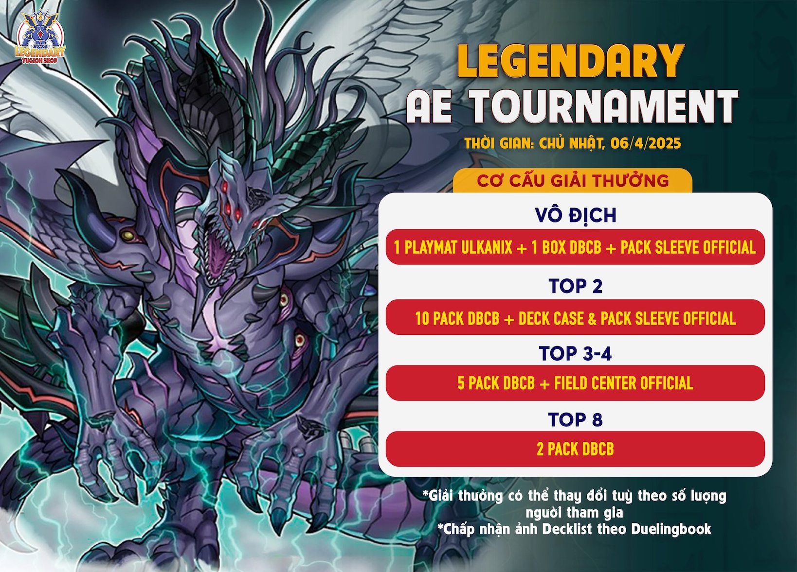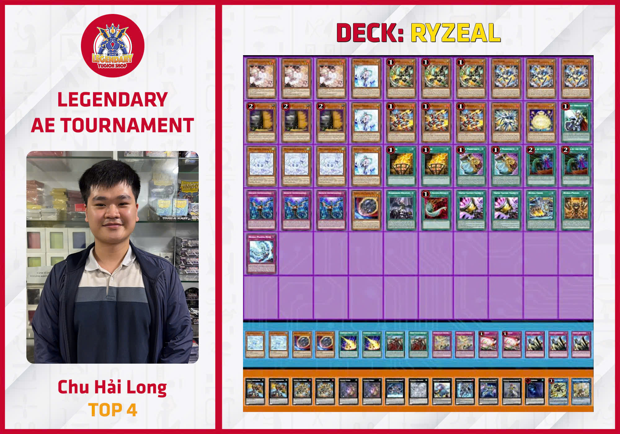 Không quá ngạc nhiên với sức mạnh của Ryzeal khi lên ngôi vô địch tại giải đấu AE ngày 06/04/2025 của Legendary Yugioh Shop. Khác với Maliss vẫn còn cần thêm những hỗ trợ trong những sản phẩm tiếp theo tại AE, thì hầu hết những quân bài tối thượng của Ryzeal đều đã có mặt, chính là những Abyss Dweller, Evilswarm Exciton Knight hay Number 41: Bagooska the Teribly Tired Tapir. Bên cạnh đó, sức mạnh của Fiendsmith tại AE là không thể bàn cãi khi chưa bị phong ấn bất kỳ mảnh ghép quan trọng nào. Chính sự kết hợp giữa sức mạnh Ryzeal và sự uyển chuyển của Fiendsmith là chìa khóa để vượt qua mọi kẻ thù lên ngôi vô địch.