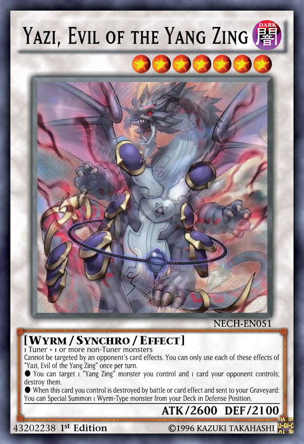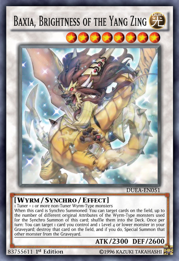 Tôi liệt kê hai thẻ bài này với nhau bởi vì chúng phần nào phục vụ cùng một mục đích. Baxia, Brightness of the Yang Zing và Yazi, Evil of the Yang Zing là những quái vật synchro wyrm ban đầu. Burst of Destiny đang mang đến cho chúng ta một trong những bộ bài mạnh nhất mà chúng ta đang có trong năm nay: Swordsoul là bộ bài Wyrm xoay quanh việc triệu hồi synchro. Baxia và Yazi không chỉ là quái vật wyrm mà còn thực sự support các bộ bài wyrm khác.