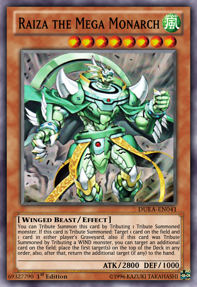 Raiza the Mega Monarch đã được coi là “đồ thừa” trong album của các bài thủ trong vài năm qua. Tuy nhiên, Floowandereeze đã ở đây để thực sự leo top meta – theo đúng nghĩa đen. Đối với một bộ bài mạnh mẽ nhưng hơi thiếu quái vật boss, Raiza hoàn toàn phù hợp với deck! Nó là một winged-beast nên có thể search lên tay được bởi các Floowandereeze. Để tôi nói cho bạn biết, không ai muốn đối mặt với một Mega Raiza có thể search được, lại có khả năng loại bỏ tối đa hai thẻ bài trên sân và một trong nghĩa địa. Loại bỏ không destroy thật đáng sợ, phải không? Điều đó tăng gấp đôi khi các effect kết thúc được bảo vệ như là chain link 1 trong cách xếp chain của deck.