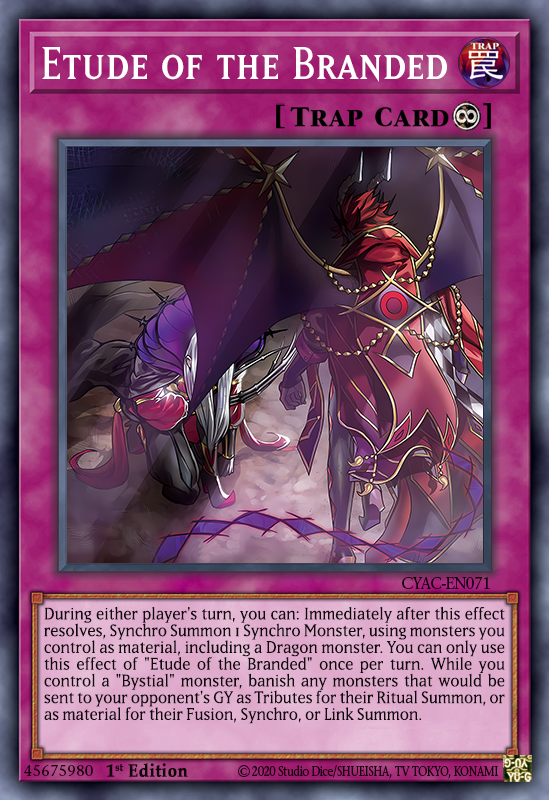 Có hai điều cần chú ý với sân này. Đầu tiên, Etude of the Branded còn có một hiệu ứng phụ, Nếu bạn điều khiển quái thú Bystial thì khi đối thủ sử dụng quái thú của họ để Ritual, Synchro, Fusion, Link đều sẽ bị banish. Điều đó thực sự tốt khi đối đồi với Unchained. Đồng thời, Crimson Gaia còn có một hiệu ứng vô cùng quan trọng cho phép triệu hồi lại Red Dragon Archfiend từ dưới mộ lên sân khi có một quái thú bị tiêu diệt. Bởi vì lí do đó nên bạn sẽ luôn muốn banish Red Dragon Archfiend thay vì là Scarred Dragon cho lượt triệu hồi của các quái thú Bystial, và Dis Paster đưa nó lại về Extra Deck sau đó lại triều hồi lên sân thêm một lần nữa.