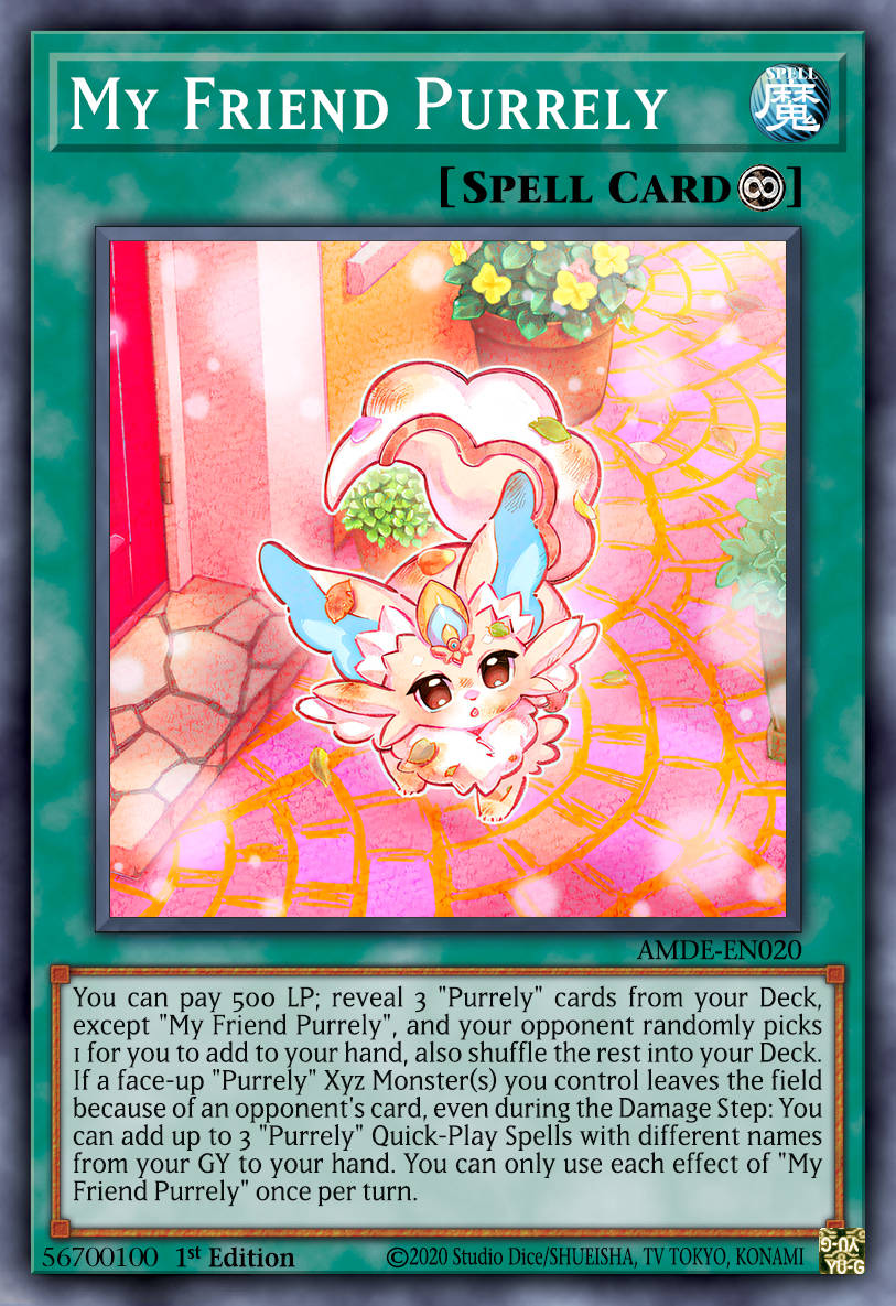 Đầu tiên chúng ta có Purrely Sharely!?, lá bài mới xuất hiện trong DUNE với hiệu ứng chọn một quái Purrely bạn điều khiển, sau đó triệu hồi đặc biệt 1 quái Purrely cấp 1 từ trong bộ bài nhưng hiệu ứng bị vô hiệu hóa, nếu làm vậy, triệu hồi đặc biệt một Purrely từ trong Extra Deck với cùng Rank với quái thú được chỉ định nhưng khác hệ, sau đó gắn một quick-play spell Purrely vào "chân" của nó