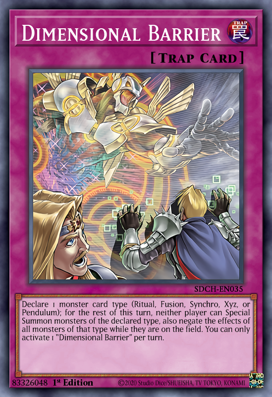 Dimensional Barrier một trong những lá bài vô cùng khó chịu với hiệu hứng chọn một trong 5 loại (Dung hợp, Synchro, Ritual, Xyz, Pendulum), Type được chỉ định sẽ không thể được triệu hồi và toàn bộ hiệu ứng trên của chúng trên sân sẽ bi vô hiệu hóa. Purrely cũng nằm trong số đi khi bộ bài có lối chơi phụ thuộc hoàn toàn vào Xyz.