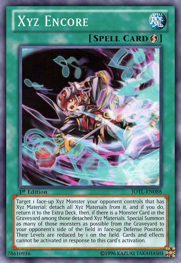 Siêu khắc tinh của các bộ bài Xyz, Xyz Encore với khả năng chọn một quái thú XYZ trên sân để tách toàn bộ nguyên liệu đồng thời đưa nó về Extra Deck. Không những vậy, hiệu ứng của lá bài này không thể bịị can thiệp vào nên gần như khi kích hoạt chính là án tử cho các quái thú bị chỉ định.