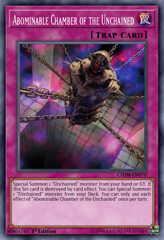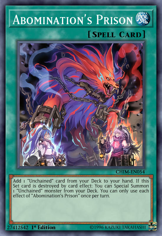 Abomination's Prison với hiệu ứng cho phép lấy một lá bài Unchained từ bộ bài lên tay và khi bị phá hủy sẽ triệu hồi một quái thú Unchained từ bộ bài lên sân. Một spell vô cùng linh hoạt khi có thể tìm kiếm các starter của bộ bài và giúp duy trì được mạch combo.