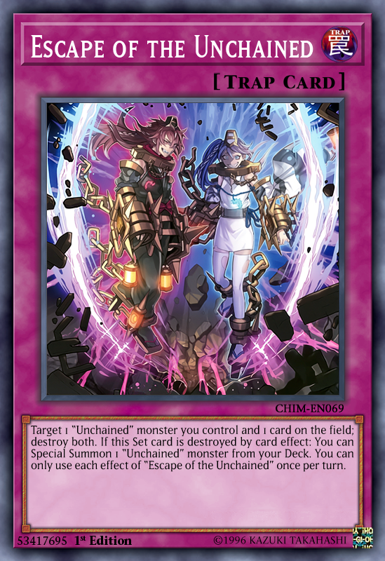 Bạn sẽ thường set Abominable Chamber of the Unchained cho phép gọi một quái thú Unchained từ trên tay hoặc dưới mộ lên sân; Hoặc Escape of the Unchained với hiệu ứng tiêu diệu một quái thú Unchained trên sân và một lá bài bên sân đối thủ. Và chúng còn một hiệu ứng khác khi bị tiêu diệt đều sẽ gọi một Unchained monster từ trong bộ bài lên sân, sự trao đổi cho những lá bài còn trống khác cho thêm nhiều tài nguyên hơn.