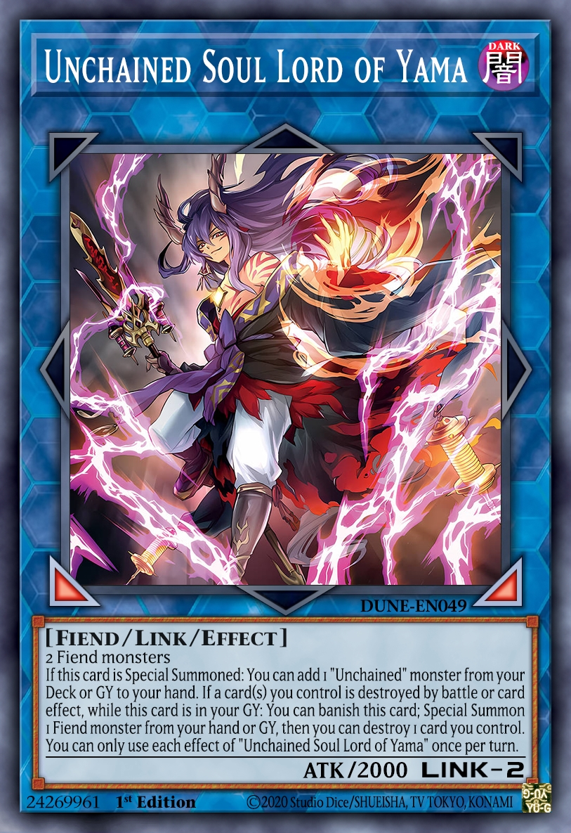 Các quái thú Extra đều mang cho mình công dụng và lợi ích thiết thực. Unchained Soul Lord of Yama một quái thú Link 2 cho phép search (tìm kiếm) một quái thú Unchained bất kì lên tay khi được triệu hồi. Nếu lá bài bạn điều khiển bị tiêu diệt bởi hiệu ứng hoặc battle khi lá này ở dưới mộ thì có thể Banish chính nó để triệu hồi đặc biệt một Fiend từ trên tay hoặc dưới mộ lên sân, sau đó có thể tiêu diệt một lá trên sân mình giúp kích hoạt hiệu ứng vốn có của archetype này.
