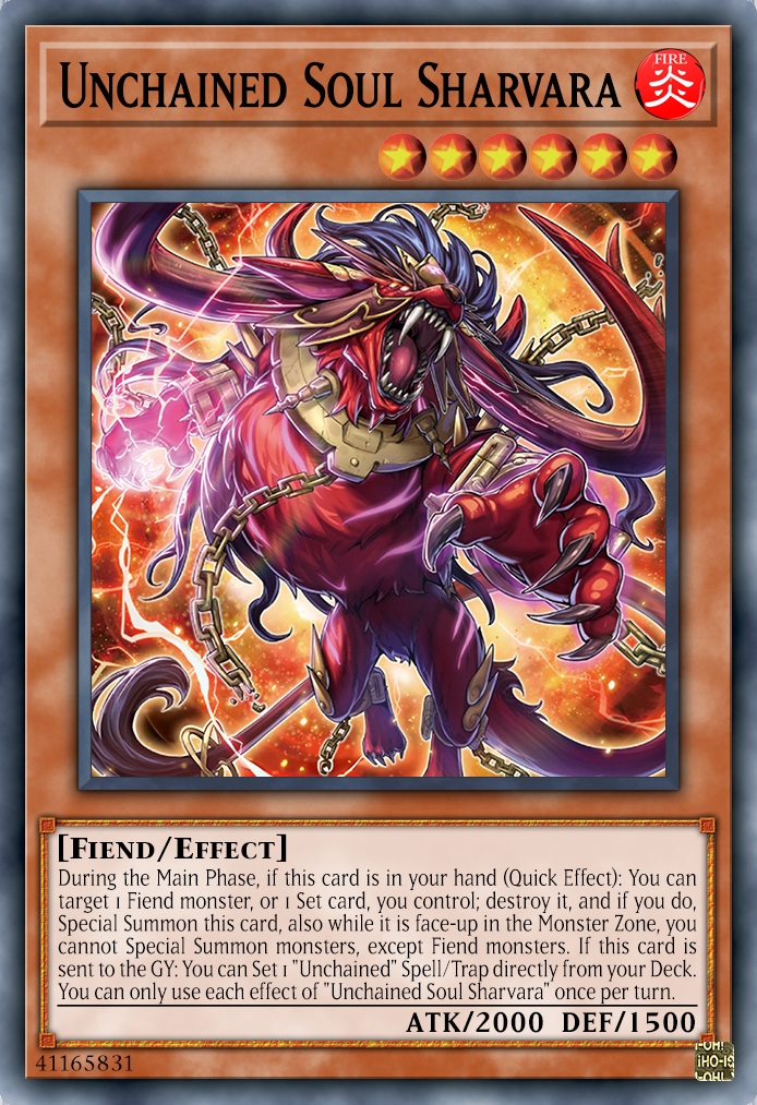 Unchained Soul of Sharvara, lá bài mạnh mẽ nhất được ra mắt trong Duelist Nexus có hiệu ứng chọn một quái thú Fiend trên sân hoặc lá bài úp mà bạn sở hữu để phá hủy và triệu hồi lá bài này lên sân đồng thời giúp set (úp) trực tiếp những phép/bẫy Unchained từ trong bộ bài mỗi khi được gửi xuống mộ, kể cả việc được send bằng cost hoặc tách nguyên liệu cho một quái thú Xyz.