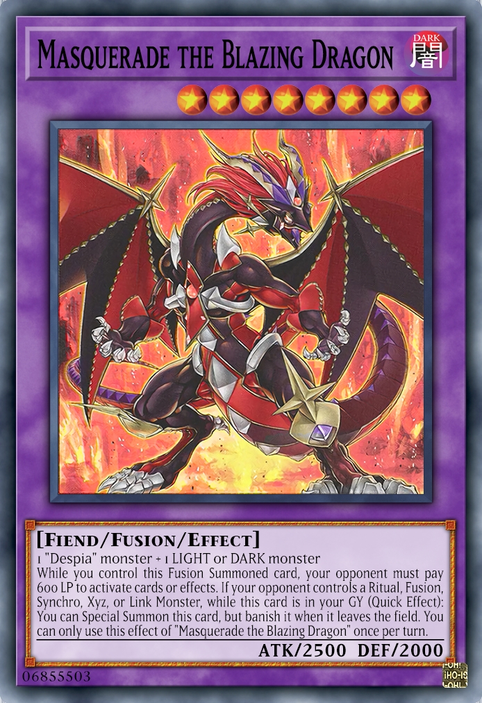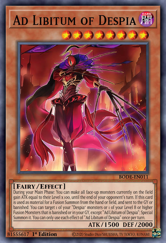Bất cứ khi nào bạn sử dụng Branded in Red để dung hợp, nguyên liệu tốt nhất để sử dụng luôn là Ad Libitum of Despia, khi bị trục xuất hoặc gửi xuống mộ dưới dạng nguyên liệu dung hợp, nó có thể triệu hồi đặc biệt một "Despia" hoặc một quái thú dung hợp cấp 8 từ mộ hoặc vùng banish