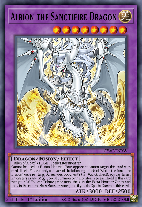 Albion the Sanctifire Dragon chính là phiên bản 2.0 của Branded Expulsion có khả năng triệu hồi 2 quái thú từ dưới mộ của cả 2 người chơi, 1 ở sân mình và 1 sang sân bạn (hiệu ứng chỉ được sử dụng trong lượt của đối thủ). Tuy không thể đưa quái thú từ vùng Banish lên sân như Expulsion nhưng là đủ để giữ combo Gimmick Puppet Lock, Ra's Disciple Lock,...vẫn còn tồn tại sau khi Expulsion bị cấm trong banlist tháng 6.