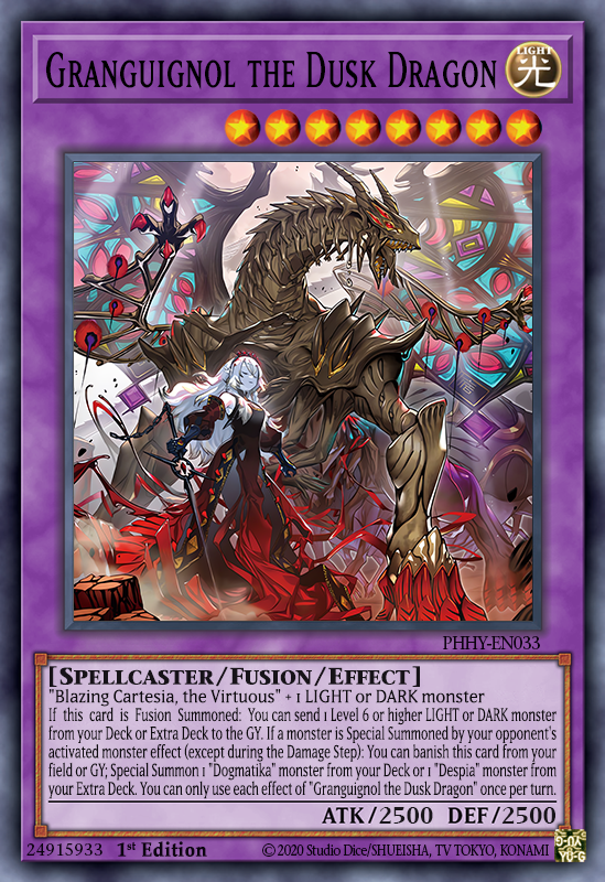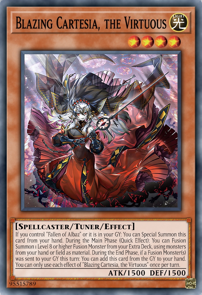 Việc combo sẽ xoay quanh Branded Fusion, Blazing Cartesia, the Virtuous để triệu hồi lên chủ lực Mirrorjade the Iceblade Dragon và Granguignol the Dusk Dragon cho việc set up để bắn phá trong lượt đối thủ. Blazing Cartesia, the Virtuous với hiệu ứng dung hợp nhanh (quick effect) nên sẽ có thể sử dụng được trong lượt của cả hai người chơi nên bạn có thể cân nhắc sử dụng sao cho hợp lí để gây cản thủ cho đối phương nhiều nhất có thể.