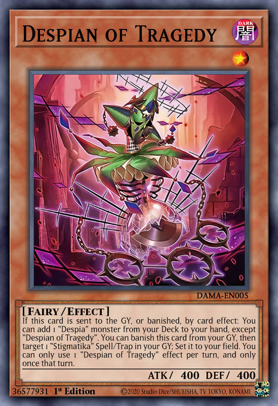Despian Tragedy là một quái thú hoàn hảo để sử dụng cho nguyên liệu Fusion khi nó sẽ kích hoạt ứng giúp tìm kiếm một quái thú Despia khi bị gửi xuống mộ bằng hiệu ứng. Bạn cũng có thể sử dụng Foolish Burial hoặc Gold Sarcophagus để có thể kích hoạt hiệu ứng này giúp gia tăng khả năng cầm Aluber the Jester of Despia trên tay.