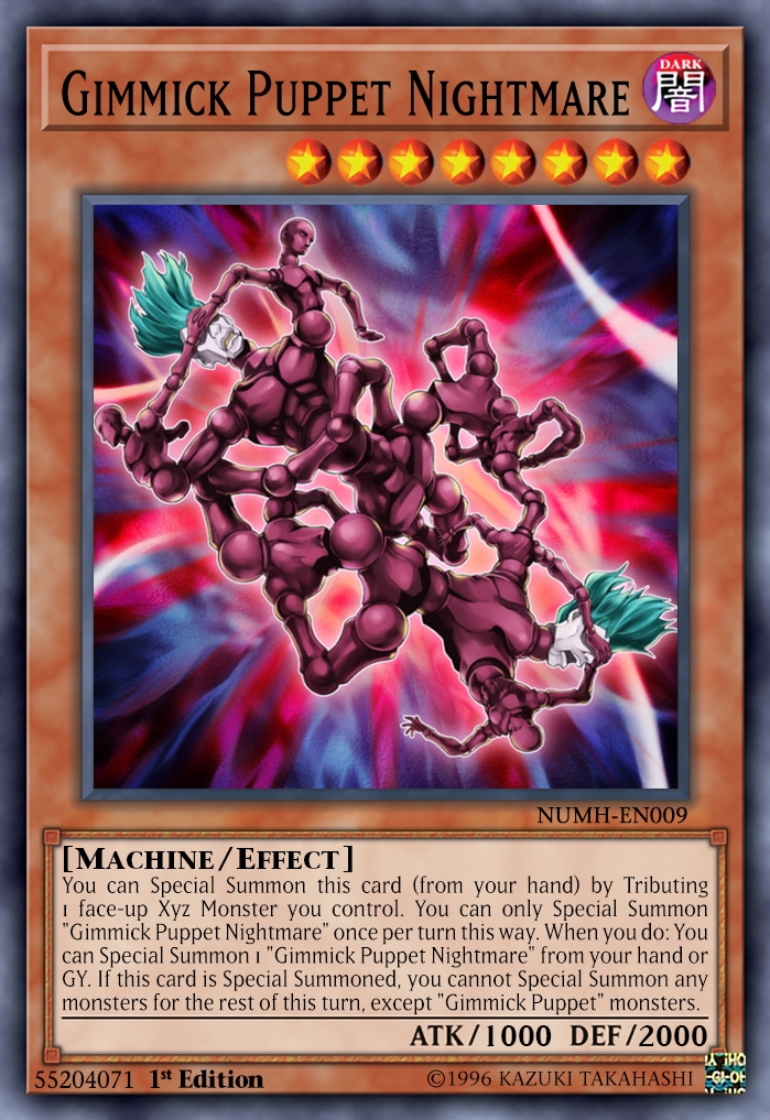 Cho những ai không biết Gimmick Puppet Knightmare làm được gì. Khi lá bài này được triệu hồi đặc biệt nó sẽ khóa không cho người chơi triệu hồi đặc biệt quái thú trừ Gimmick Puppet. Vì đây là Lingering effect nên sẽ được áp dụng khi nó xuất hiện nên dường như là một án tử đối với ai dính combo này (có thể ngoại trừ Floowandereeze).