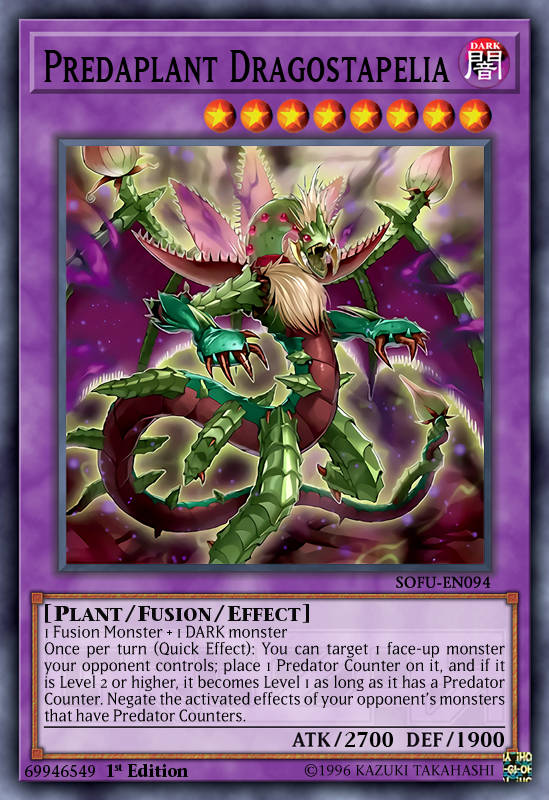 Predaplant Dragostapelia cũng là một quái vật dung hợp với khả năng làm tê liệt quái vật hiệu ứng và là mục tiêu được lựa chọn phổ biến để triệu hồi thông qua lá bài Super Polymerization. Nguyên liệu dung hợp hoàn hảo cho Super Poly đồng thời vô cùng khó chịu với Spright cũng như các bộ bài Synchro khác khi bị áp dụng hiệu ứng số sao sẽ trở thành 1.