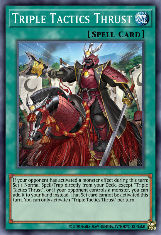 Để liên tục cầm đươc lá bài này lên tay một các ổn định Triple Tatics Thrust sẽ giúp ta điều đó. Với hiệu ứng tìm kiếm một phép/bẫy thường khi đối thủ kích hoạt một hiệu ứng quái thú bất kì trong lượt của bạn, sẽ giúp bạn ổn định lấy lên Branded Fusion cũng như Fusion Duplication.