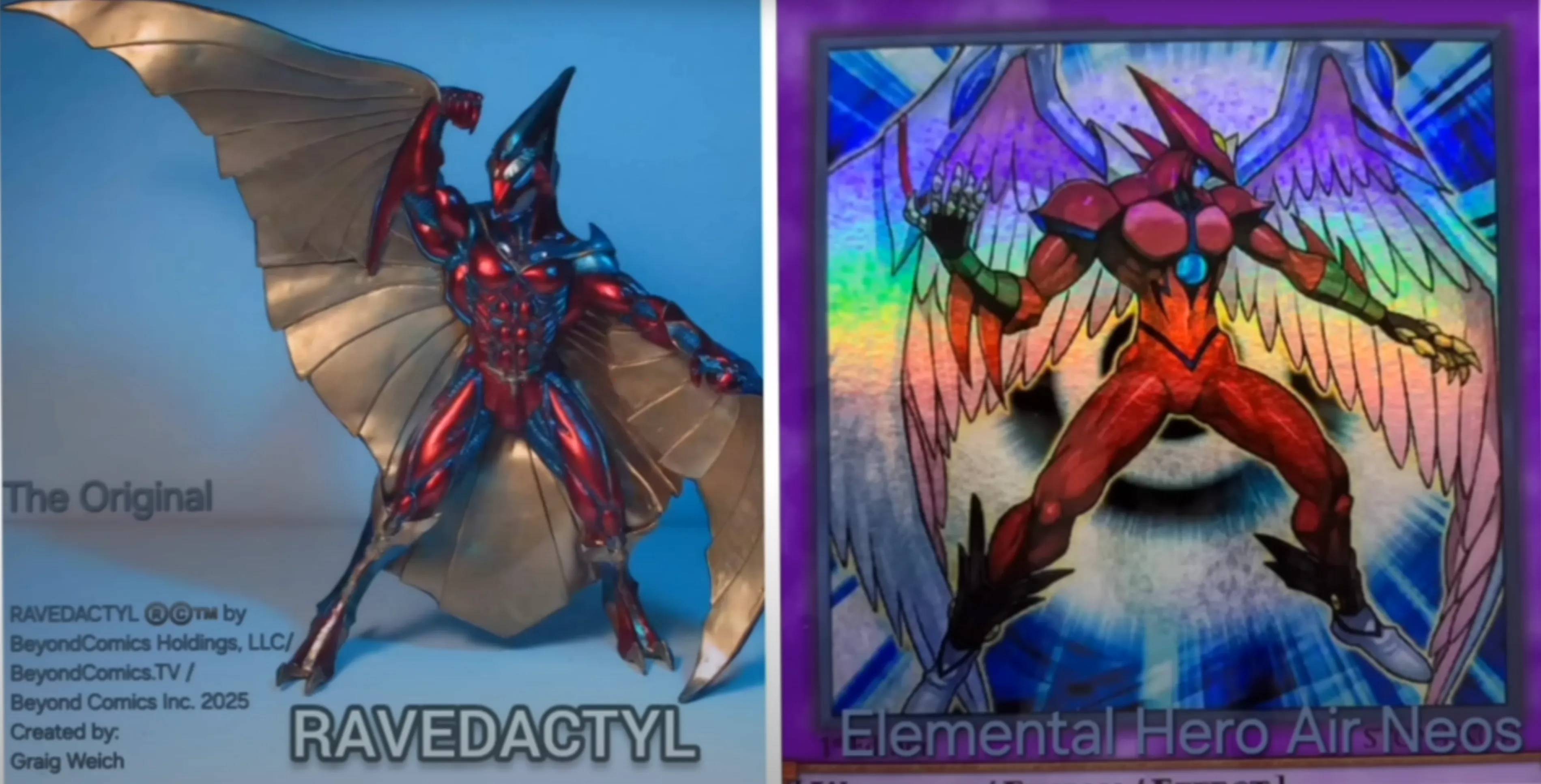 Cho đến thời gian gần đây, việc Air Neos chính thức bị xóa bỏ các nền tảng media của YGO đã được xác nhận. Lý do được đưa ra là vào ngày 11 tháng 4 năm 2008, hãng truyện tranh của Mỹ Beyond Comics đã nộp đơn khiếu nại đến thành phố New York cáo buộc có sự trùng hợp về hình ảnh giữa Elemental Hero Air Neos với nhân vật của hãng Ravedactyl. Họ đòi phải đền bù thiệt hại cho hãng, với khoản tiền lên đến 140 triệu USD. Ngoài ra, họ yêu cầu dỡ bỏ những sản phẩm bị cho là đạo nhái. Đội ngũ pháp lý của hãng thậm chí còn dựa vào lời nói của cha đẻ YGO - Kazuki Takahashi năm 2007 khi ông nói mình lấy cảm hứng tạo ra các Elemental HERO và Neos từ các hình tưởng siêu anh hùng của các hãng truyện tranh Mỹ.