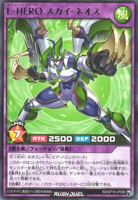 Dàn Elemental HERO và Neos cũng đã ra mắt trong Rush Duel. Vậy nhưng, thay vì được bê nguyên artwork giống như những người bạn của mình, Air Neos lại bị đổi tên thành Elemental HERO Sky Neos với artwork khác hoàn toàn, duy chỉ có effect vẫn còn có điểm tương đồng. Đặt vào hoàn cảnh các Neo-Spacians khác không hề có sự thay đổi gì, và hình ảnh của Air Neos bị xóa bỏ hoàn toàn trên các nền tảng trực tuyến tiếp cận người chơi khiến cho trường hợp này càng trở lên đáng nghi.