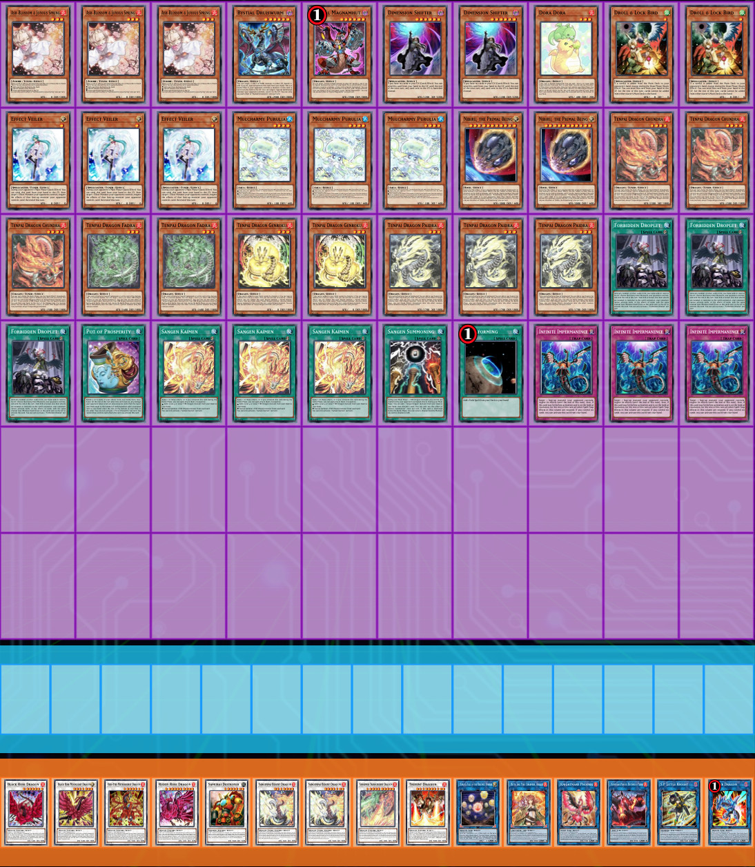 - Card pool được dùng đến hết Infinite Forbidden (trừ những TCG exclusive), nên metagame khá giống OCG thời điểm sau banlist tháng 7, trước Rage of the Abyss. Khi mà meta top 1 Snake-Eye bị hit nặng nề, Tenpai còn 1 field, Yubel full power và R-ACE cho thấy sự trỗi dậy. Chúng ta có thể tham khảo 2 giải đấu lớn tiêu biểu trong khoảng thời gian này là Asia Championship và Japan Championship.