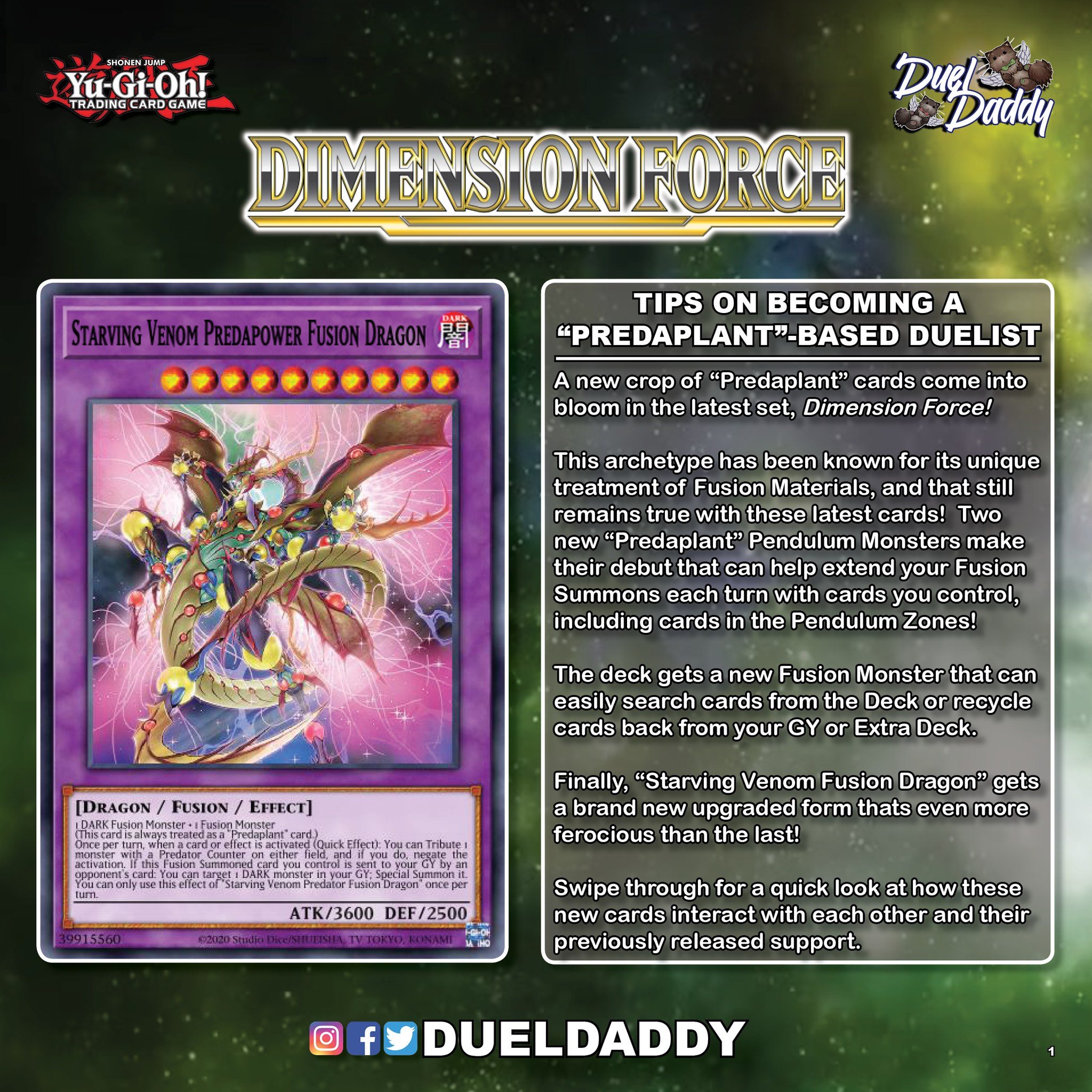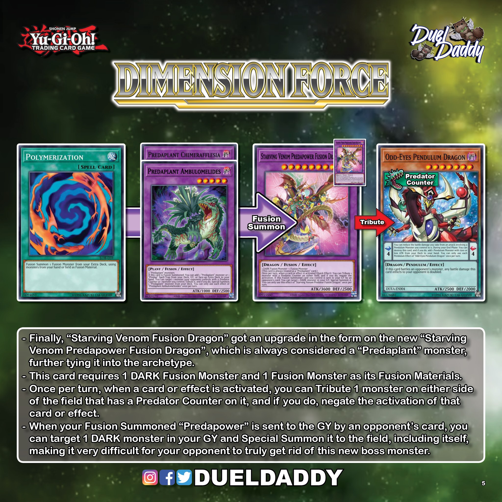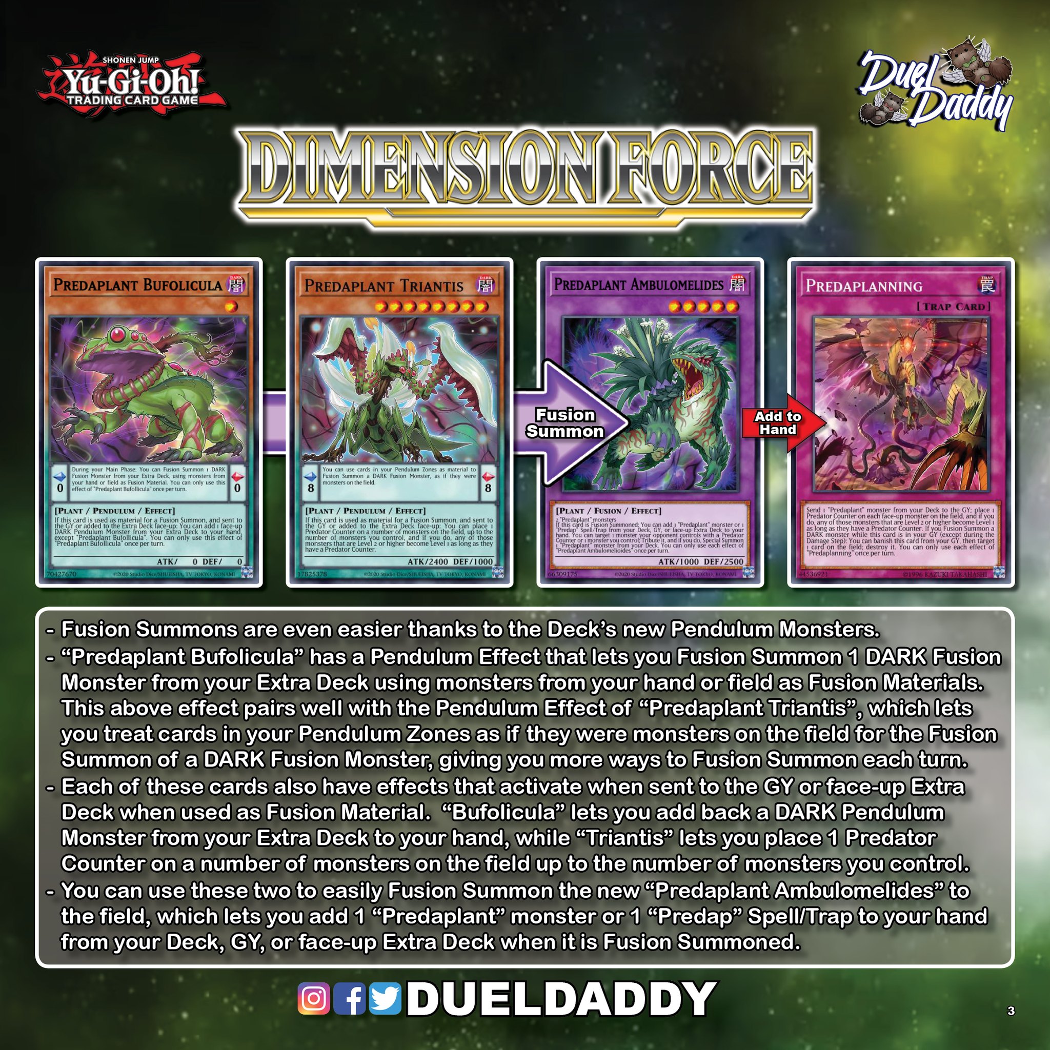 Như hứa hẹn, Dimension Force sẽ mang tới hai quái thú Predaplant loại Pendulum, chúng đem tới cho người chơi khả năng Triệu hồi Dung hợp bằng cách sử dụng cả những lá bài trong Pendulum Zone. Đi cùng với đó là một quái thú dung hợp mới có khả năng search bài từ Deck, cũng như tái chế lại những lá bài ở GYhoặc Extra Deck. Cuối cùng là một phiên bản nâng cấp cho quái thú Dung hợp nổi tiếng Starving Venom Fusion Dragon, với sức mạnh còn lớn hơn bản trước.