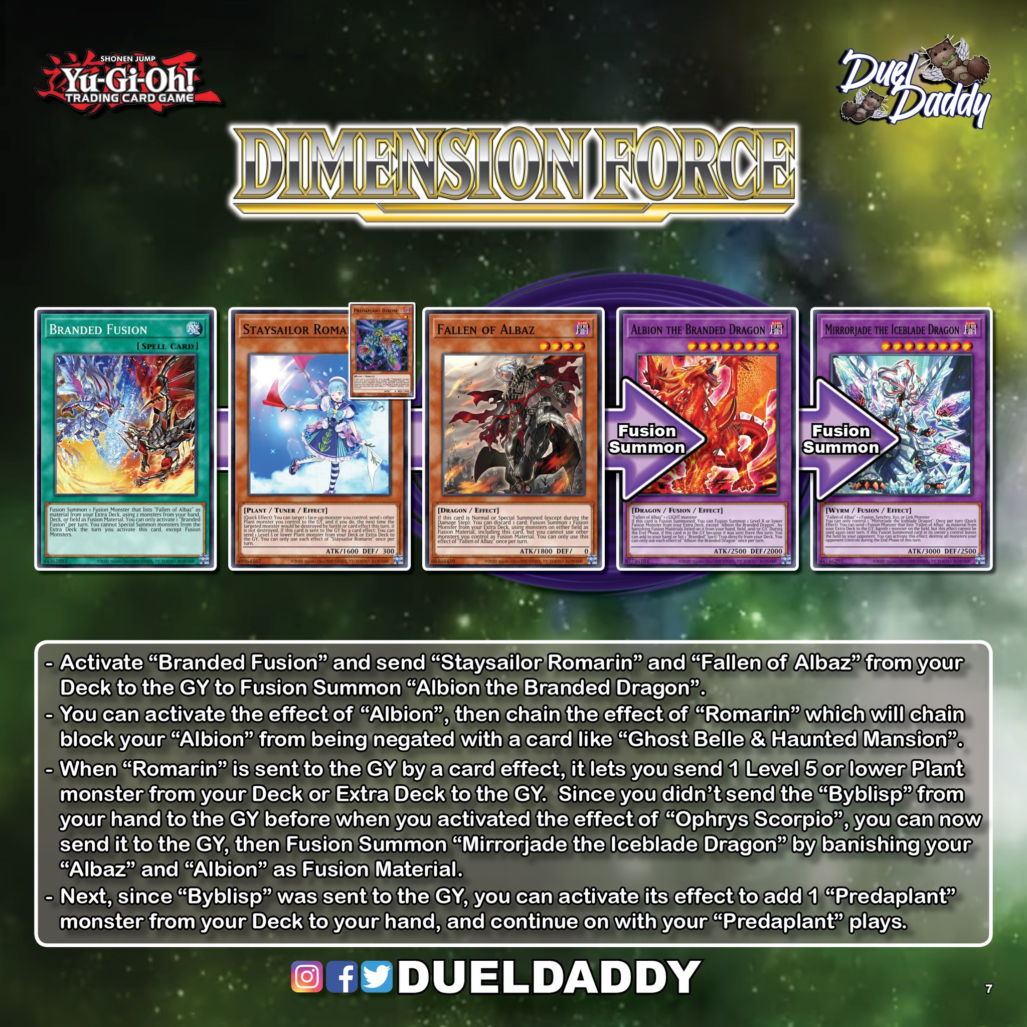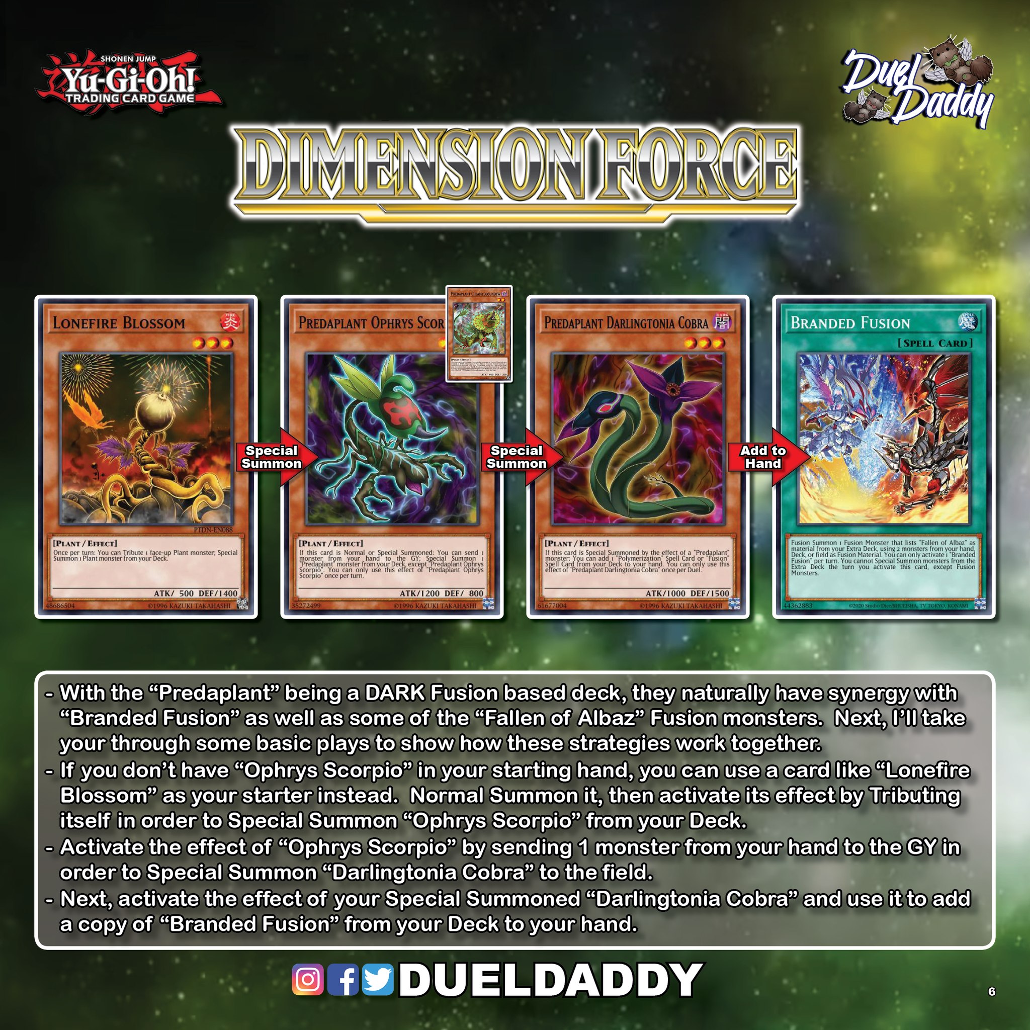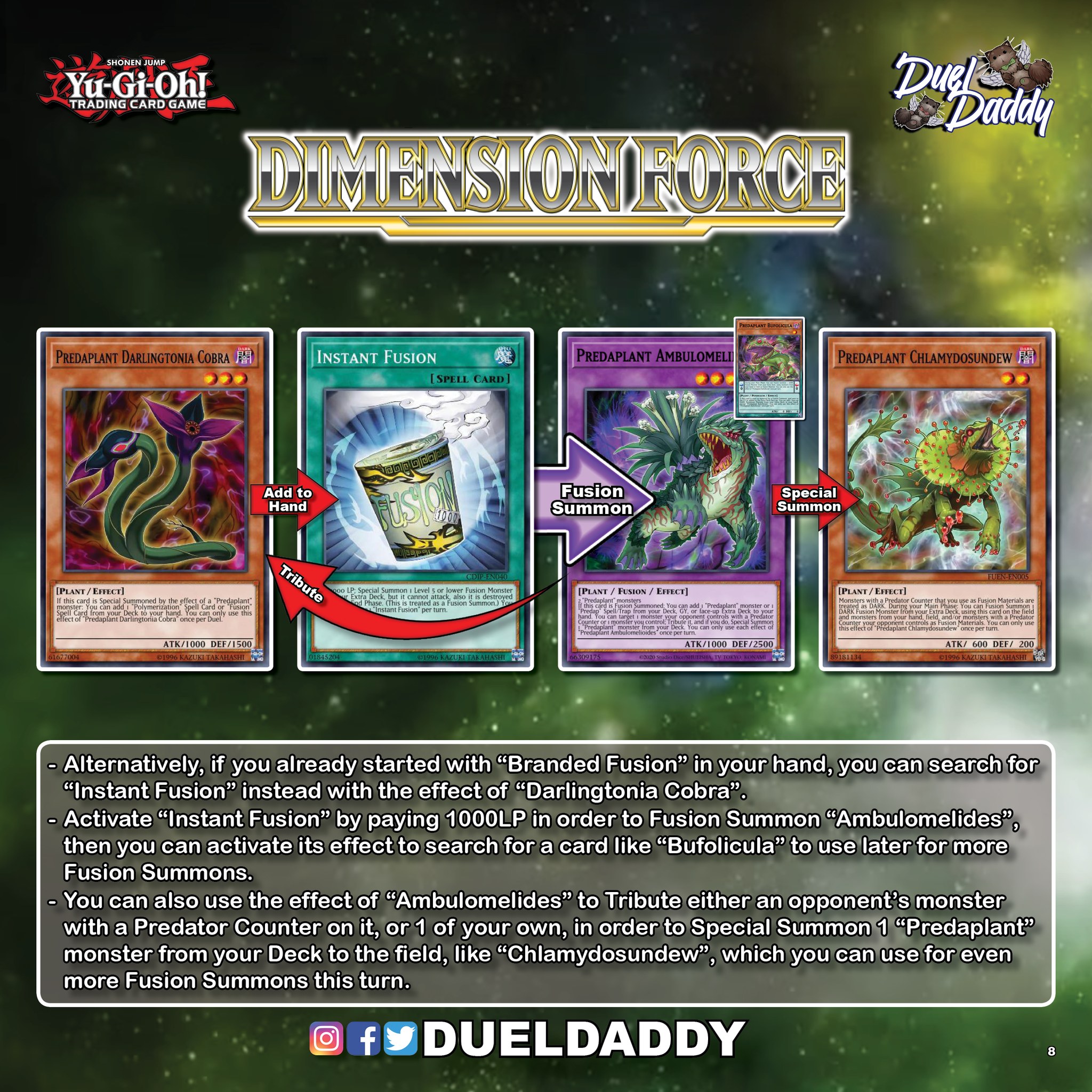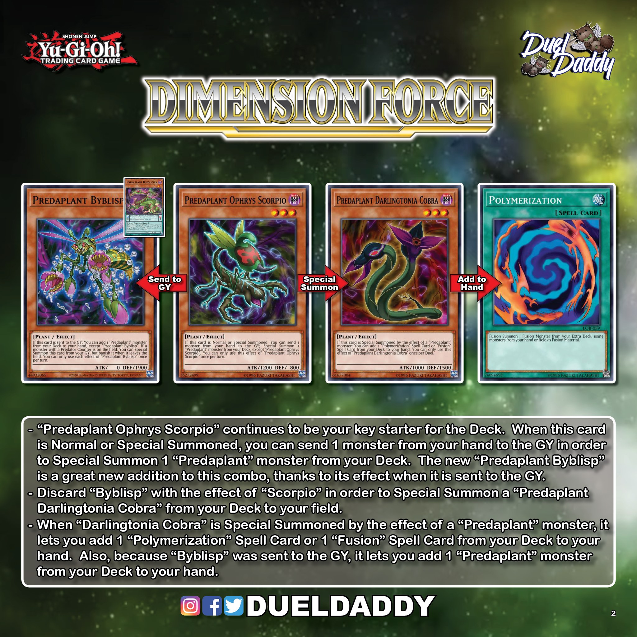 Như hứa hẹn, Dimension Force sẽ mang tới hai quái thú Predaplant loại Pendulum, chúng đem tới cho người chơi khả năng Triệu hồi Dung hợp bằng cách sử dụng cả những lá bài trong Pendulum Zone. Đi cùng với đó là một quái thú dung hợp mới có khả năng search bài từ Deck, cũng như tái chế lại những lá bài ở GYhoặc Extra Deck. Cuối cùng là một phiên bản nâng cấp cho quái thú Dung hợp nổi tiếng Starving Venom Fusion Dragon, với sức mạnh còn lớn hơn bản trước.