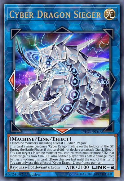 Và giải pháp đã được KONAMI đưa ra cho các bài thủ Cyber Dragon bằng cách ra mắt Cyber Dragon Sieger. Là một LINK-2 Monster, Cyber Dragon Sieger sỡ hữu một điều kiện triệu hồi quá đơn giản cho những ai chơi bộ bài này, không hề khó trong việc Link Summon mà hiệu quả mang lại thì vô cùng cao. Sỡ hữu khả năng giúp tăng sức tấn công cho 1 quái thú Machine có sức công 2100 ATK hoặc hơn lên thêm 2100 ATK nữa, gần như là một sự thay thế hoàn hảo cho Limiter Removal. Đối với một Chimeratech Rampage Dragon còn có khả năng tấn công 3 lần thì việc OTK không cần phải bàn cãi.