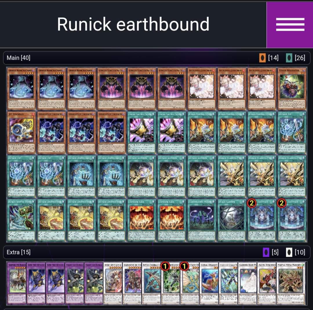 Runick luôn là 1 bộ bài cực kì thành công của format TCG. Các biến thể từ Spright, Floodgate, Bystial đều đã đạt cho mình những thành công nhất định. Và bây giờ chúng ta có Runick Earthbound, dùng những lá bài Earthbound Servant/Prisoner được ra mắt trong hộp Maze of Millennia.