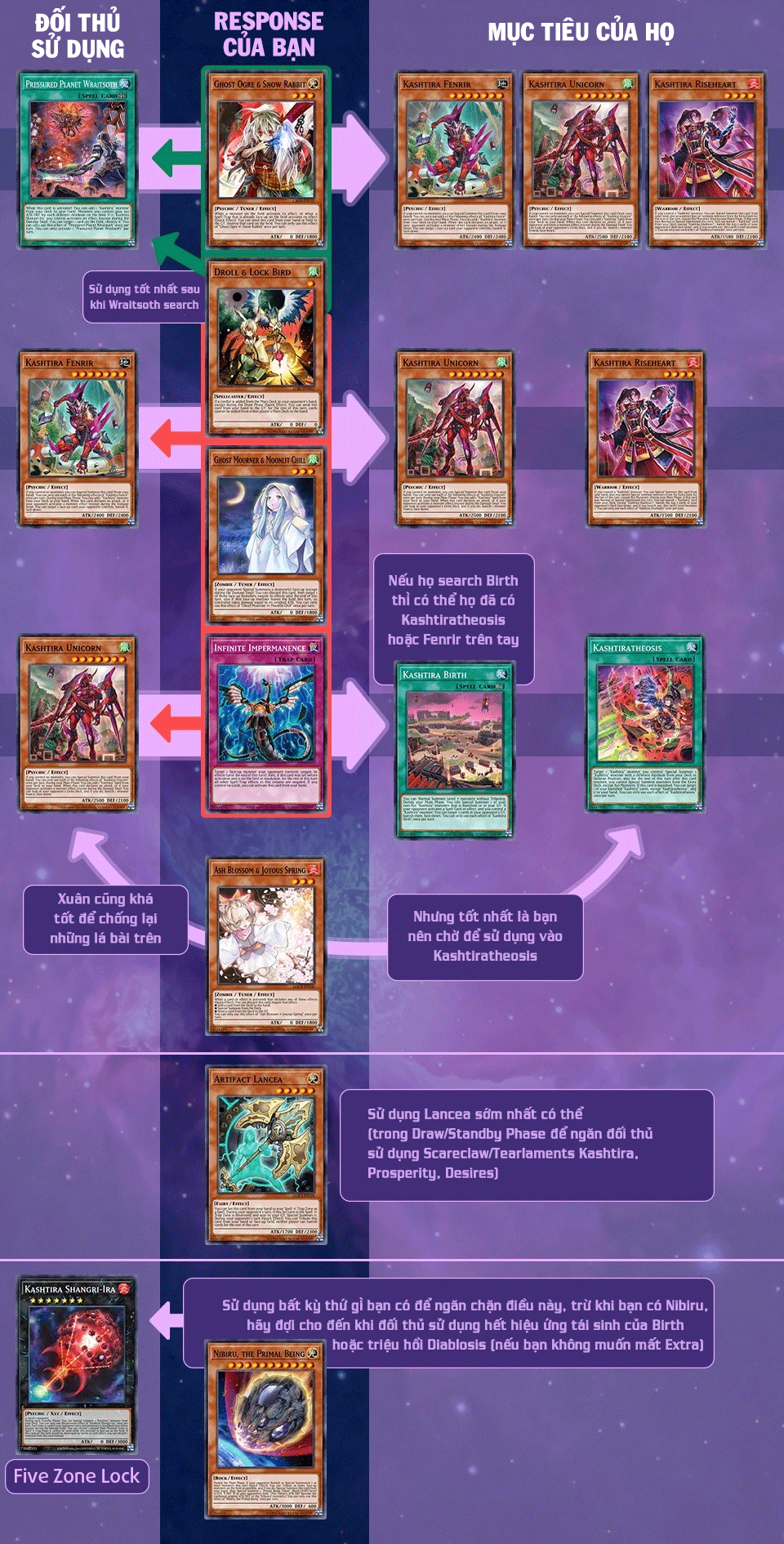 Artifact Lancea: ngăn chặn Kashtira mở rộng tài nguyên và khả năng tương tác trên field. Vì Kashtira xoay quanh việc đưa các lá bài vào Banish Zone, Lancea có thể được áp dụng vào hầu hết mọi thời điểm, và thường ngăn đối phương thậm chí không thể triệu hồi con boss Kashtira Arise-Heart.
