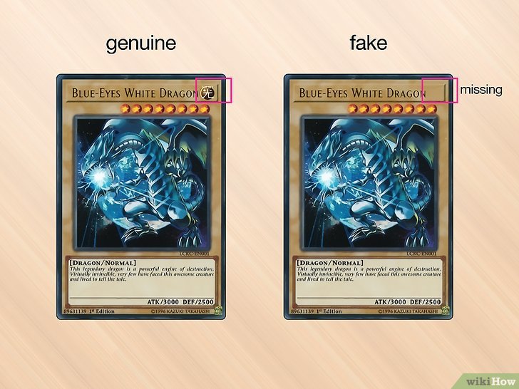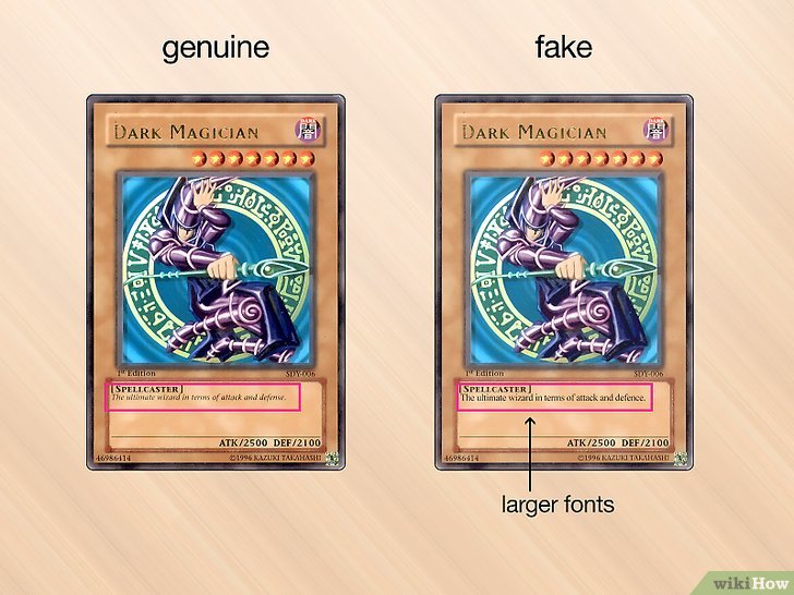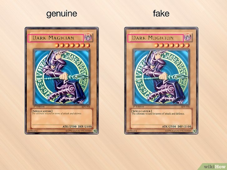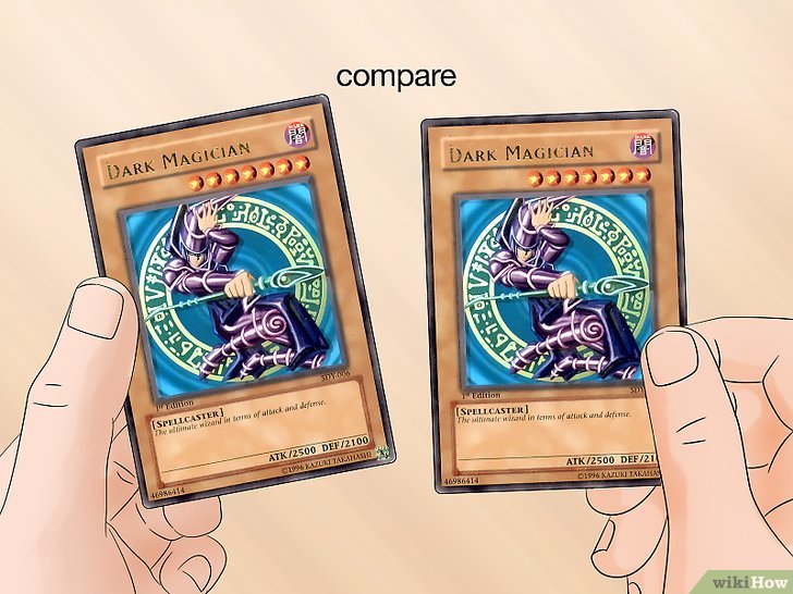 So sánh 2 lá bài giống nhau để tìm ra sự khác biệt. Dù bạn có kế hoạch mua lá bài trực tuyến hay trực tiếp, hãy luôn so sánh lá bài được bán với các phiên bản chính hãng để bạn có thể tìm ra bất kỳ sự khác biệt nào. Nếu lá bài mà họ cố gắng bán cho bạn có bất kỳ sự khác biệt nào, thì chúng là giả.
