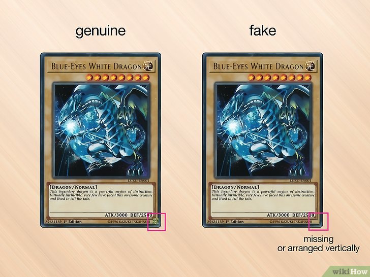 Mẹo: Tem màu vàng cho thấy rằng thẻ đó là phiên bản đầu tiên (1st Edition) hoặc phiên bản giới hạn (Limited Edition) của lá bài. Điều này có nghĩa là nó rất có giá trị! Màu bạc sẽ xuất hiện trên thẻ bài thật nếu không có 2 dòng chữ trên và được gọi chung là phiên bản không giới hạn (Unlimited Edition). Các trường hợp lá bài được thể hiện là 1st hoặc Limited Edition nhưng có tem màu bạc, thì nó là giả.