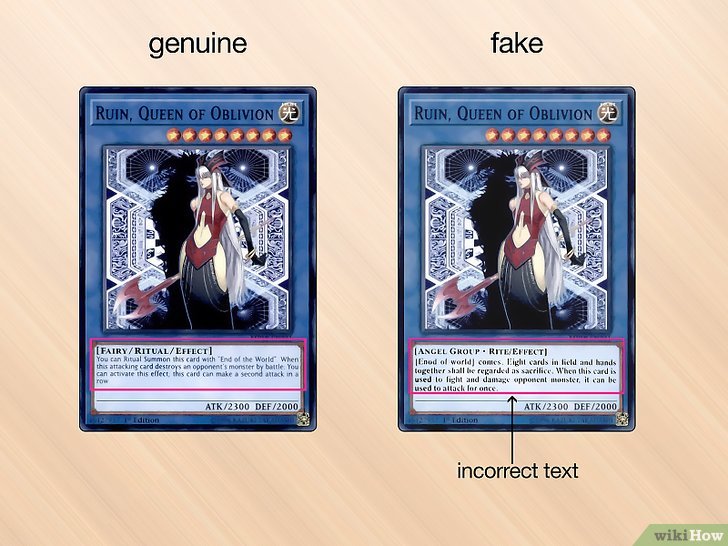 Xác nhận rằng văn bản hiệu ứng (khung effect) là chính xác. Tìm kiếm lá bài trên mạng để xem hiệu ứng của nó trong phiên bản chính thức trông như thế nào. Sau đó, so sánh để tìm bất kỳ thay đổi về cách dùng từ hoặc cú pháp nào. Ngay cả những sự khác biệt nhỏ cũng có nghĩa là lá bài đó là hàng giả.