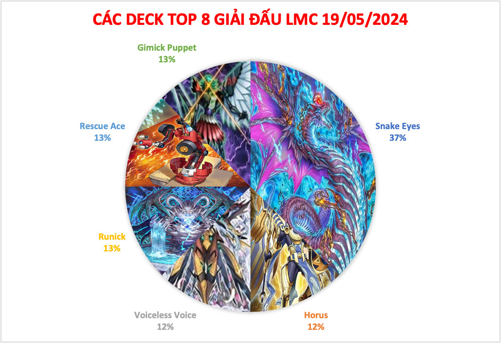 Sau 5 trận vòng loại đấu diễn ra căng thẳng và vô cùng kịch liệt, Top 8 của giải đấu lần này là những bộ bài vô cùng đa dạng: Snake-Eyes Fiendsmith, Voiceless Voice, Snake-Eye Fire King, Gimmick Puppet, Naturia Runick, Therion Horus, R-ACE và Snake-Eyes Melodious.