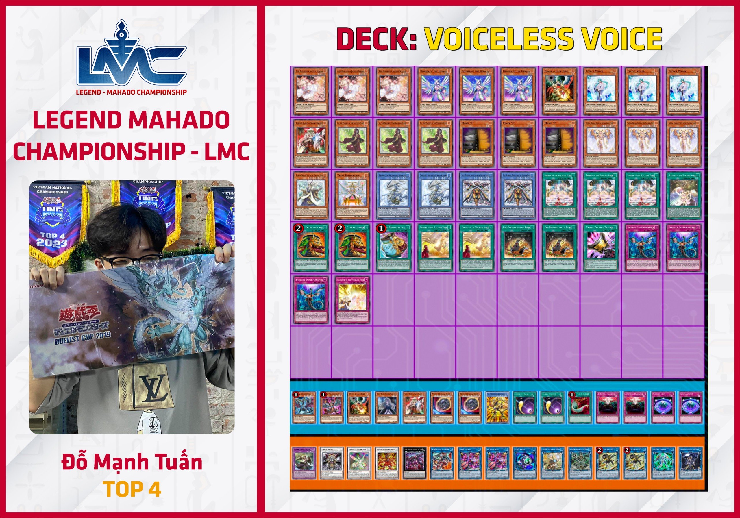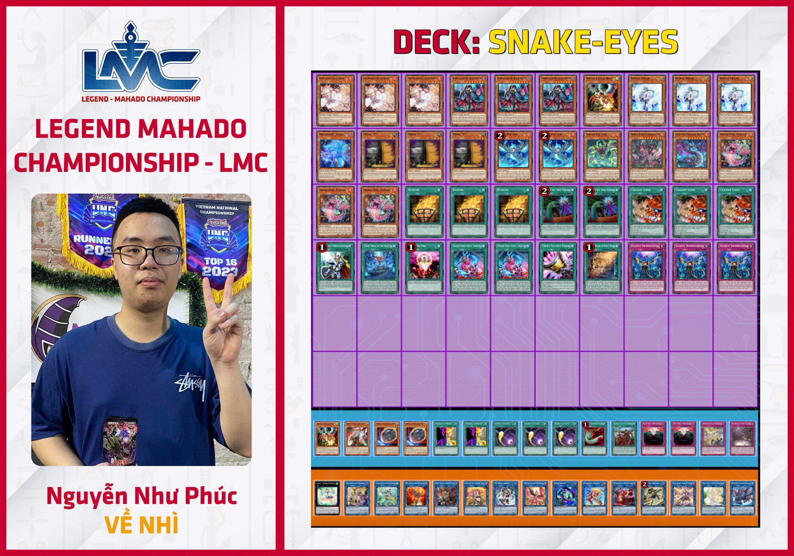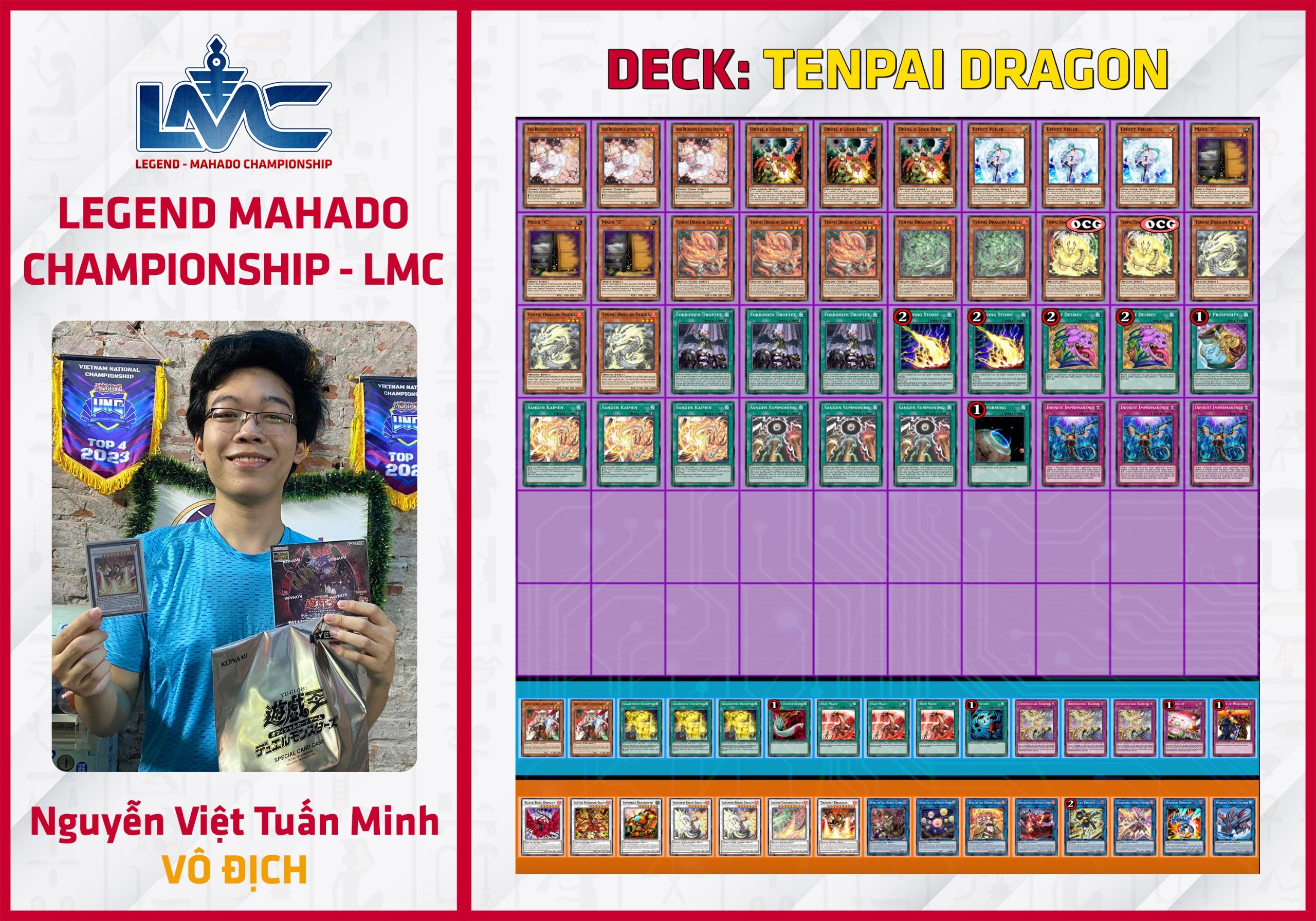 Trong số các Deck meta hiện tại, Tenpai Dragon vừa mới được nhận những support quý giá từ Booster Box mới nhất là Infinite Forbidden (INFO) nên Deck đã ổn định lại càng trở nên ổn định hơn bao giờ hết. Tenpai Dragon of Genroku cho phép bạn triệu hồi trực tiếp 1 Tenpai Dragon từ Deck. Giờ đây, Tenpai Dragon có rất nhiều cách để gọi Rồng từ Deck ra, bên cạnh chủ bài Tenpai Dragon Chundra hay Sangen Kaimen. Nhận thấy tiềm năng của Deck, bài thủ Nguyễn Việt Tuấn Minh đã chớp lấy cơ hội và lên ngôi vô địch giải đấu LMC #2 với Deck Tenpai Dragon.