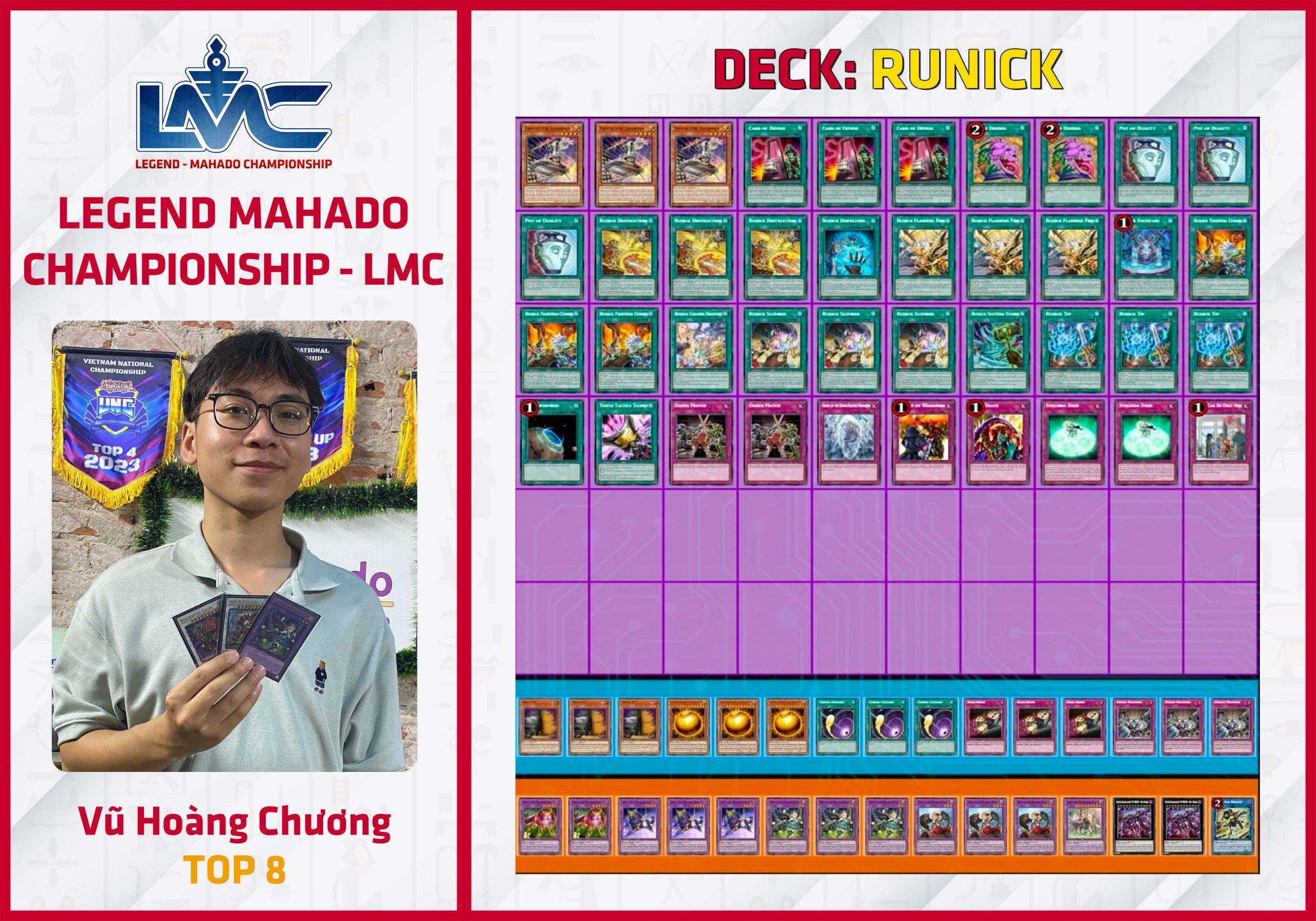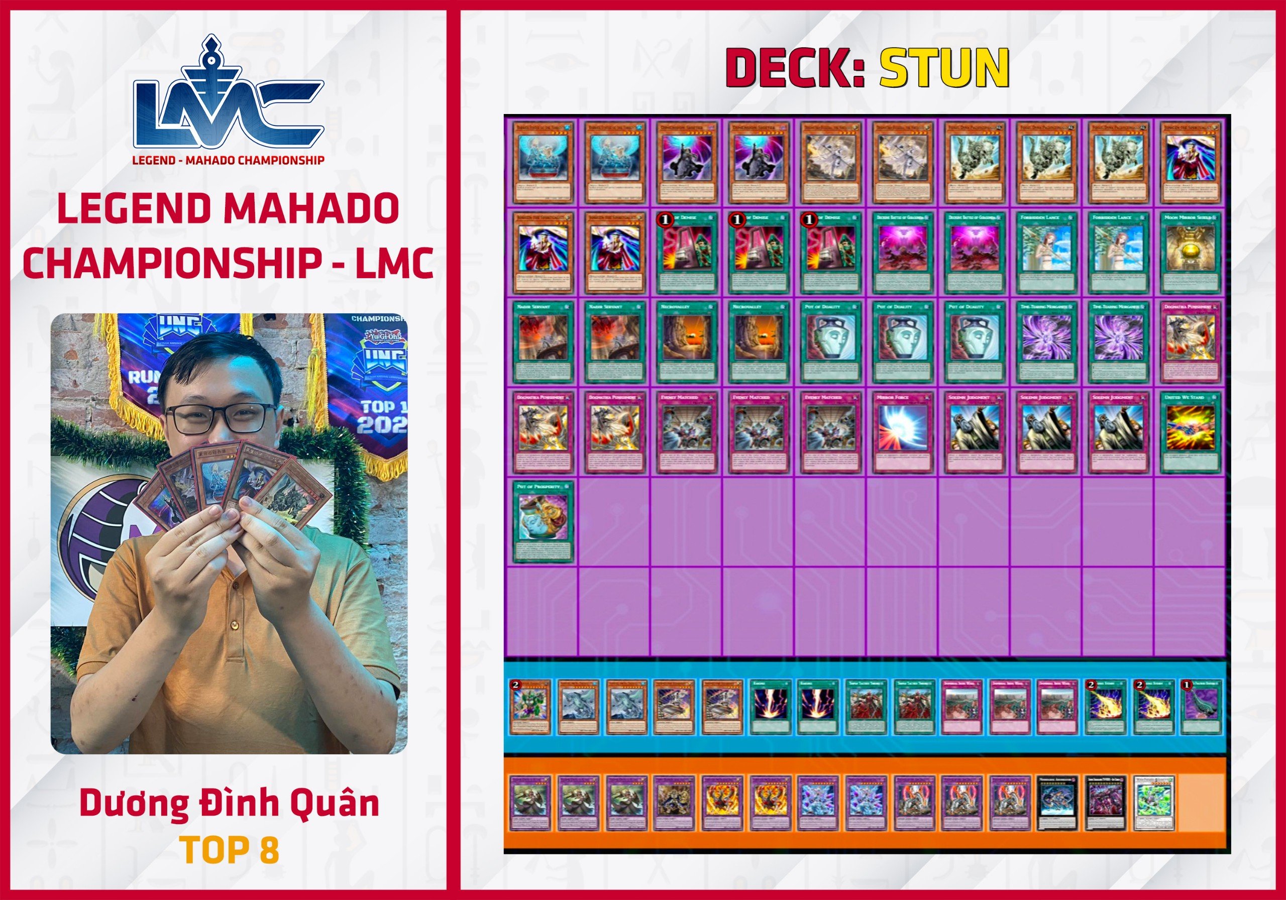 Sau 5 Round đấu diễn ra căng thẳng và vô cùng kịch liệt, Top 8 của giải đấu lần này là những Deck “vừa lạ mà lại vừa quen”: Tenpai Dragon, Snake-Eye (biến thể Fire King và thuần), Voiceless Voice, Runick (biến thể mix và stun), và Stun Deck. Trong các Deck Top 8, bài thủ Dương Đình Quân đã gây bất ngờ với bộ bài Stun anti-meta. Lối chơi vô cùng đơn giản, và việc chiến thắng “đổ dice” nhiều lần là sức mạnh chính của bộ bài này!