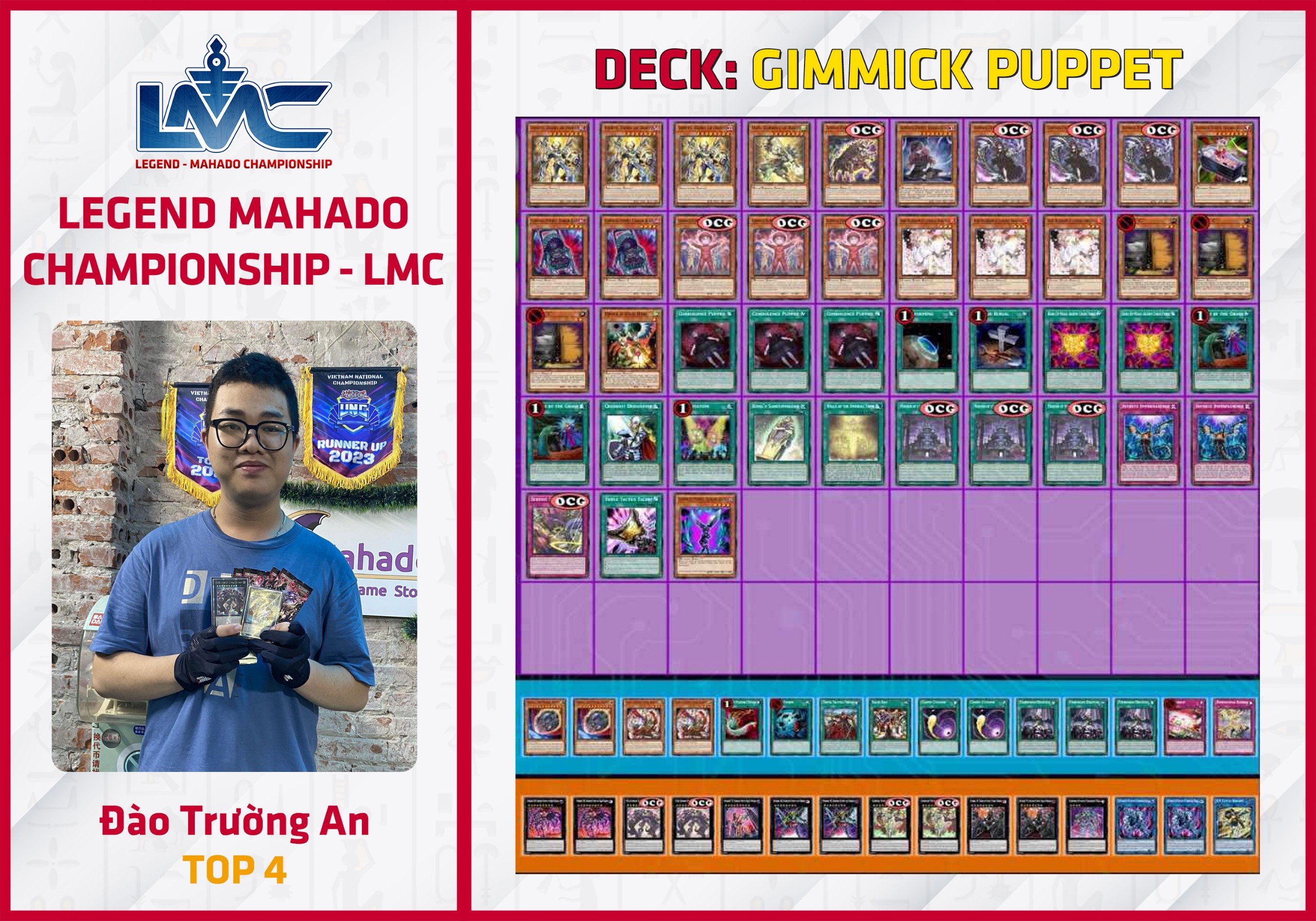 Giải đấu lần này tiếp tục chứng kiến sự trỗi dậy thú vị của 1 bộ bài FTK mới: Gimmick Puppet. Những lá bài mới trong set INFO đã cho phép Deck rất dễ dàng FTK, không còn”gimmick” như trước. Sau chiến thắng hủy diệt của bài thủ Chử Minh Hoàng tại LMC lần trước, lần này bài thủ Đào Trường An tiếp tục tiến sâu vào tận Bán Kết với Deck FTK Gimmick Puppet.