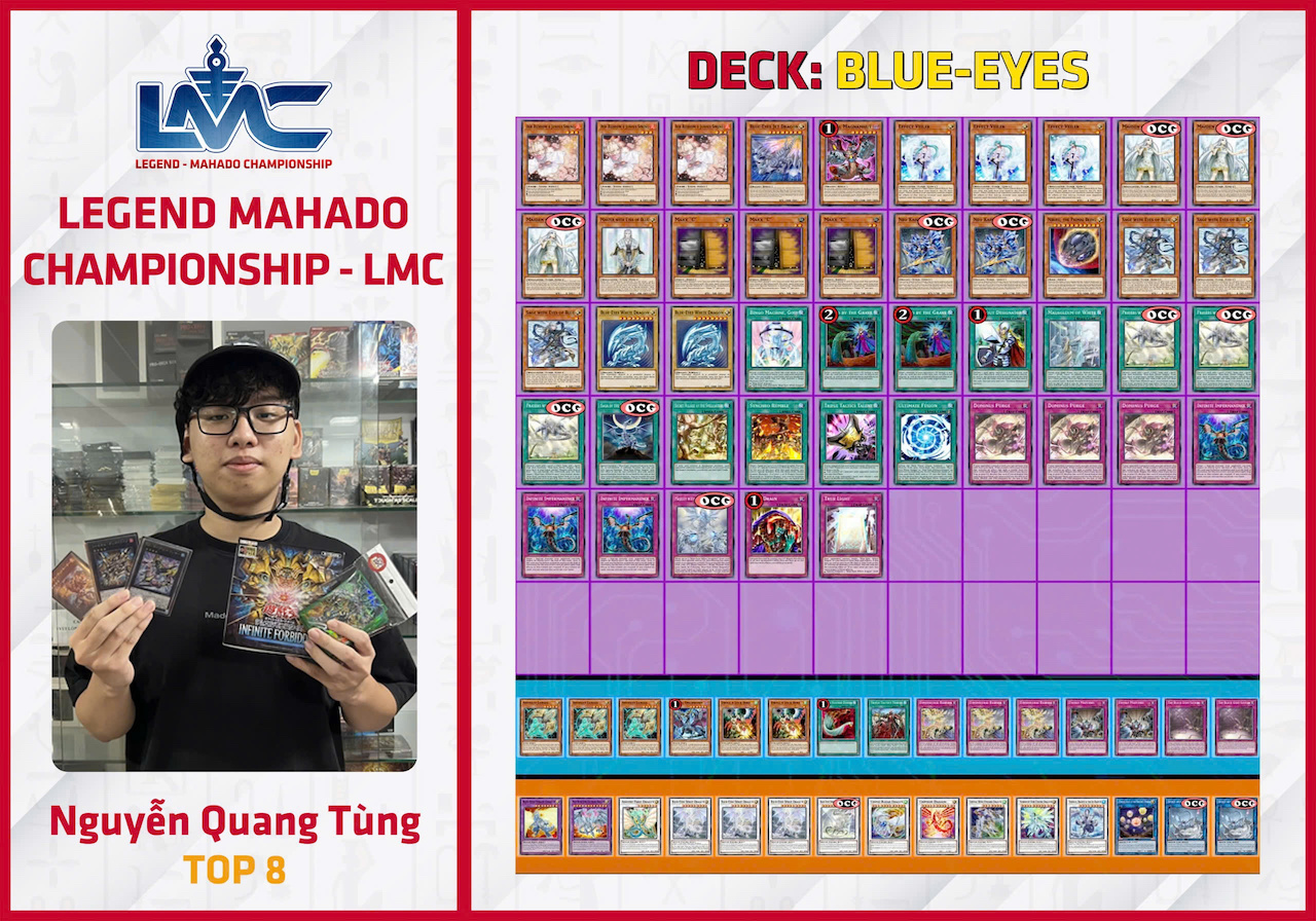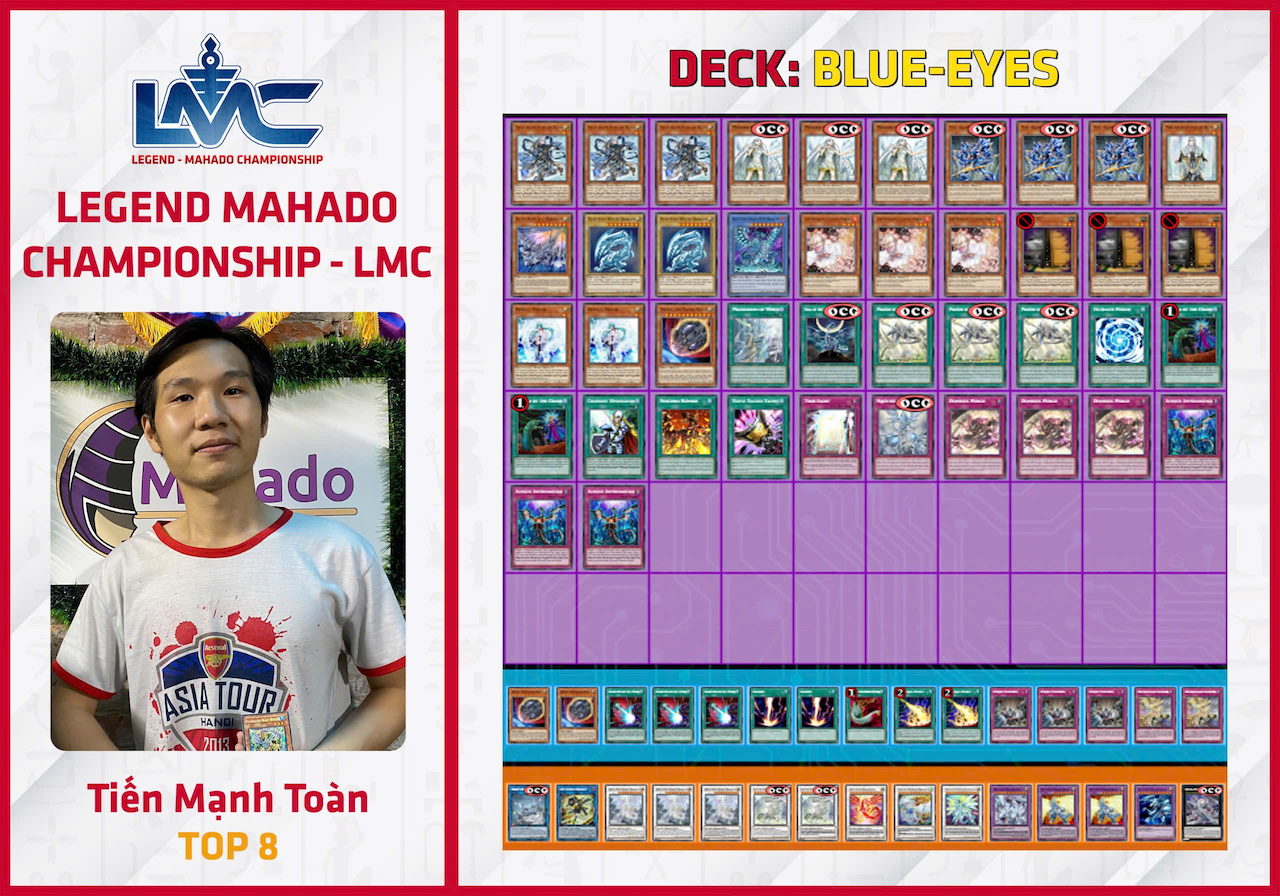 Nói qua về Blue-Eyes, đây là một Deck được thiết kế rất phù hợp cho meta game hiện tại: dễ dàng combo, chơi được nhiều hand trap và đặc biệt, đây có lẽ là Deck có thể ra NHIỀU NEGATE nhất trong 1 turn (10+ negate nếu chơi đúng). Một khi đi trước và đối thủ không có đủ hand trap để cản, cực kì khó để có thể vượt qua bàn 10+ negate của Blue-Eyes. 2 bài thủ Tiến Mạnh Toàn và Nguyễn Quang Tùng đã chứng minh cho sự thành công của Blue-Eyes khi cả 2 đều vào top 8, và chỉ chịu thua khi đối thủ được quyền đi trước và dàn ra field quá mạnh.
