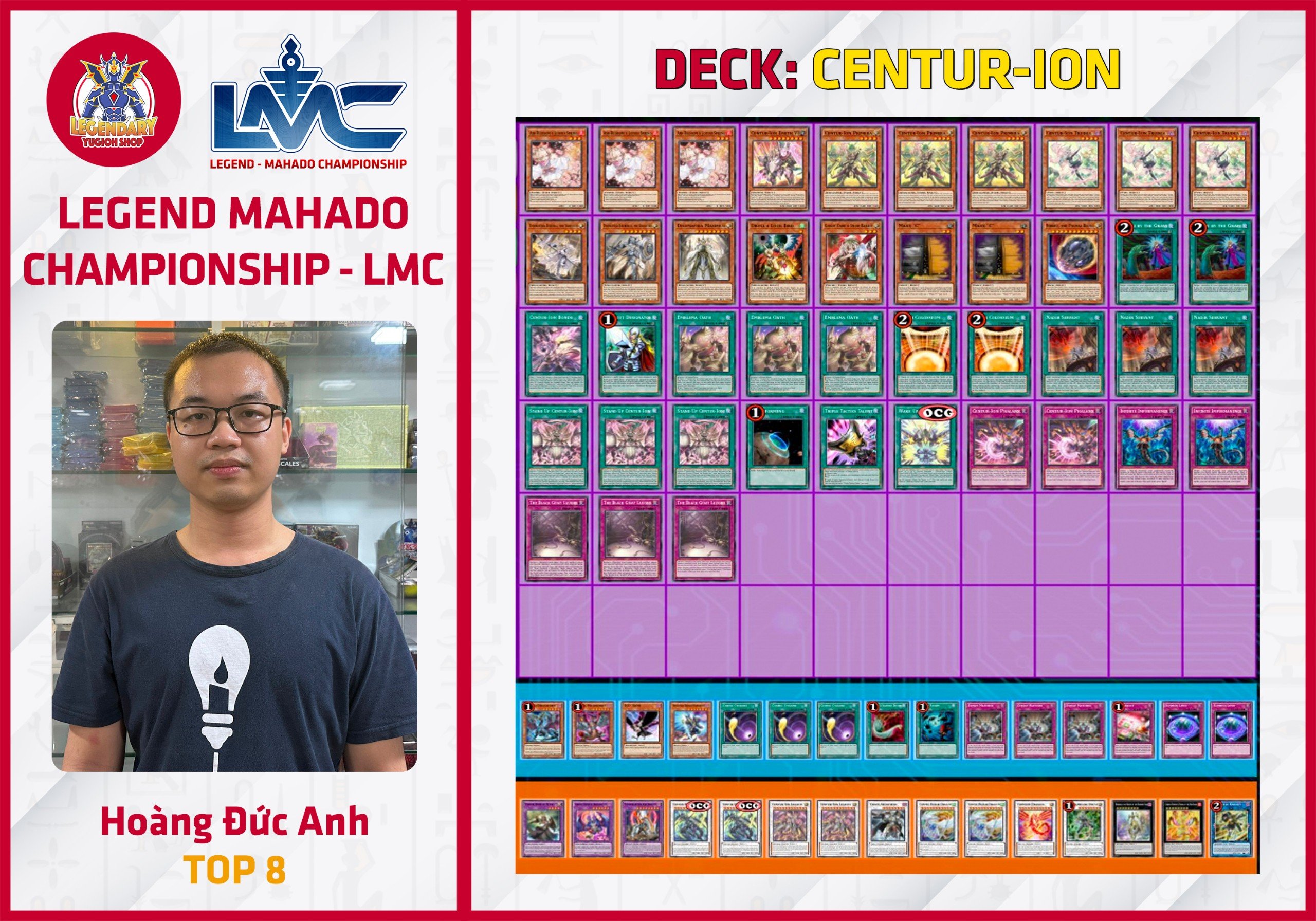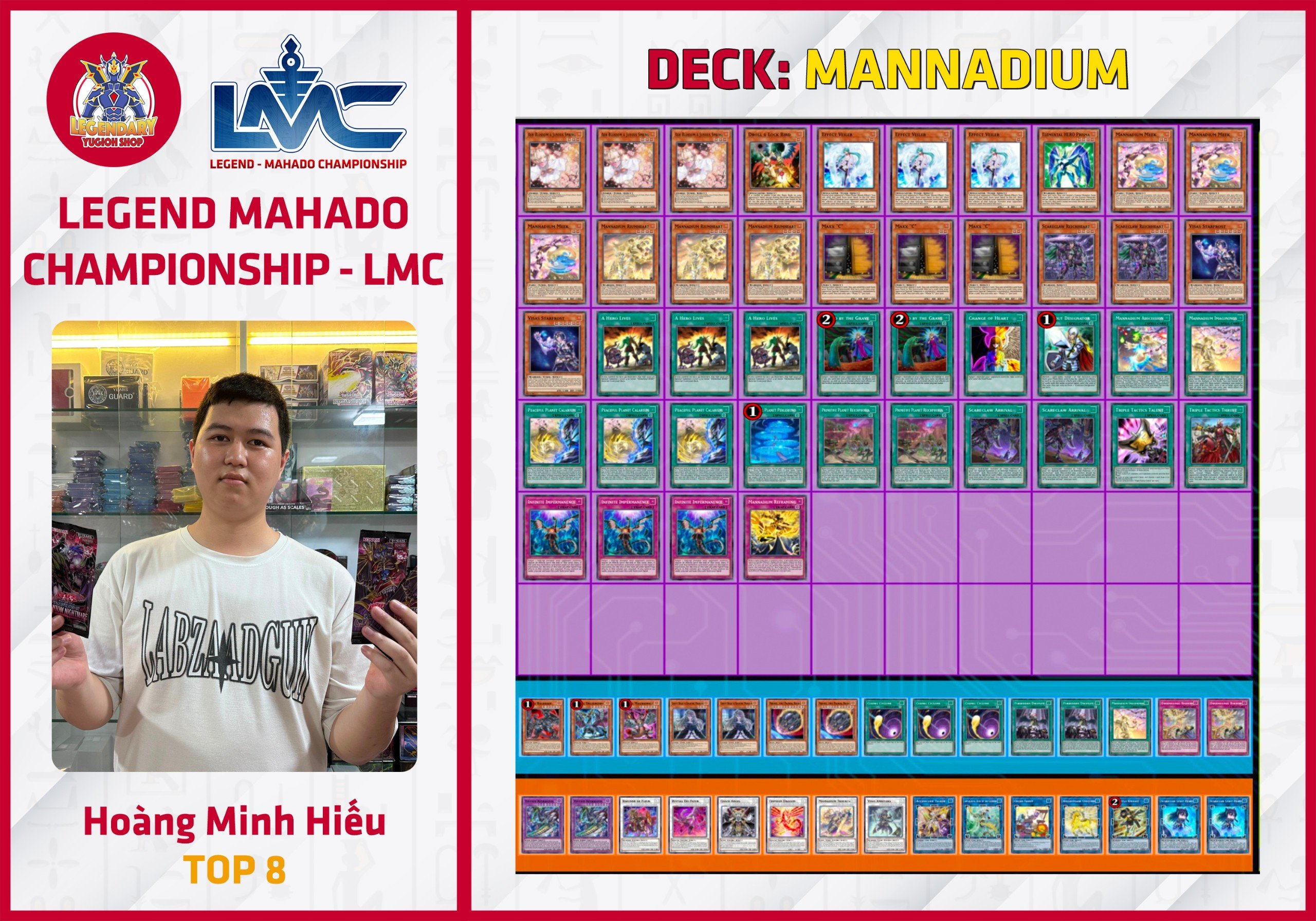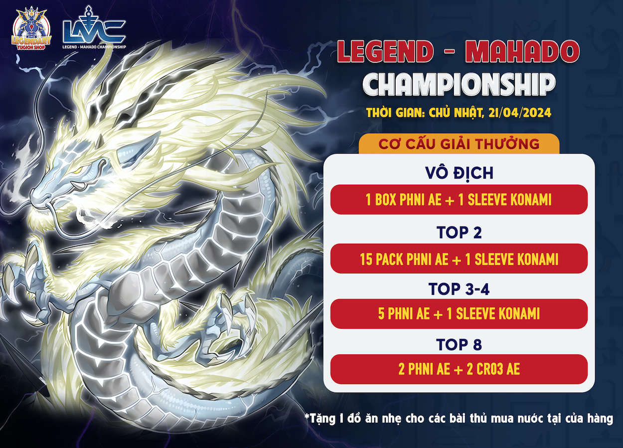 Giải đấu Legend - Mahado Championship (LMC) đầu tiên, đánh dấu sự kết hợp của 2 cửa hàng Legendary Yugioh Shop và Mahado Game Store, đã diễn ra thành công tốt đẹp vào Chủ Nhật ngày 21/04 vừa qua. Hệ thống giải đấu LMC là hệ thống thi đấu Ranking có định hướng phát triển theo format Asian English (AE) đang được Konami tiến hành áp dụng cho các nước Đông Nam Á. Để hưởng ứng phong trào cũng như để chuẩn bị tốt cho format AE, hệ thống LMC - tuy vẫn tạm thời sử dụng format OCG để thi đấu - đã và đang áp dụng nhiều ưu đãi lớn cho những người chơi sử dụng card AE do Konami phát hành.