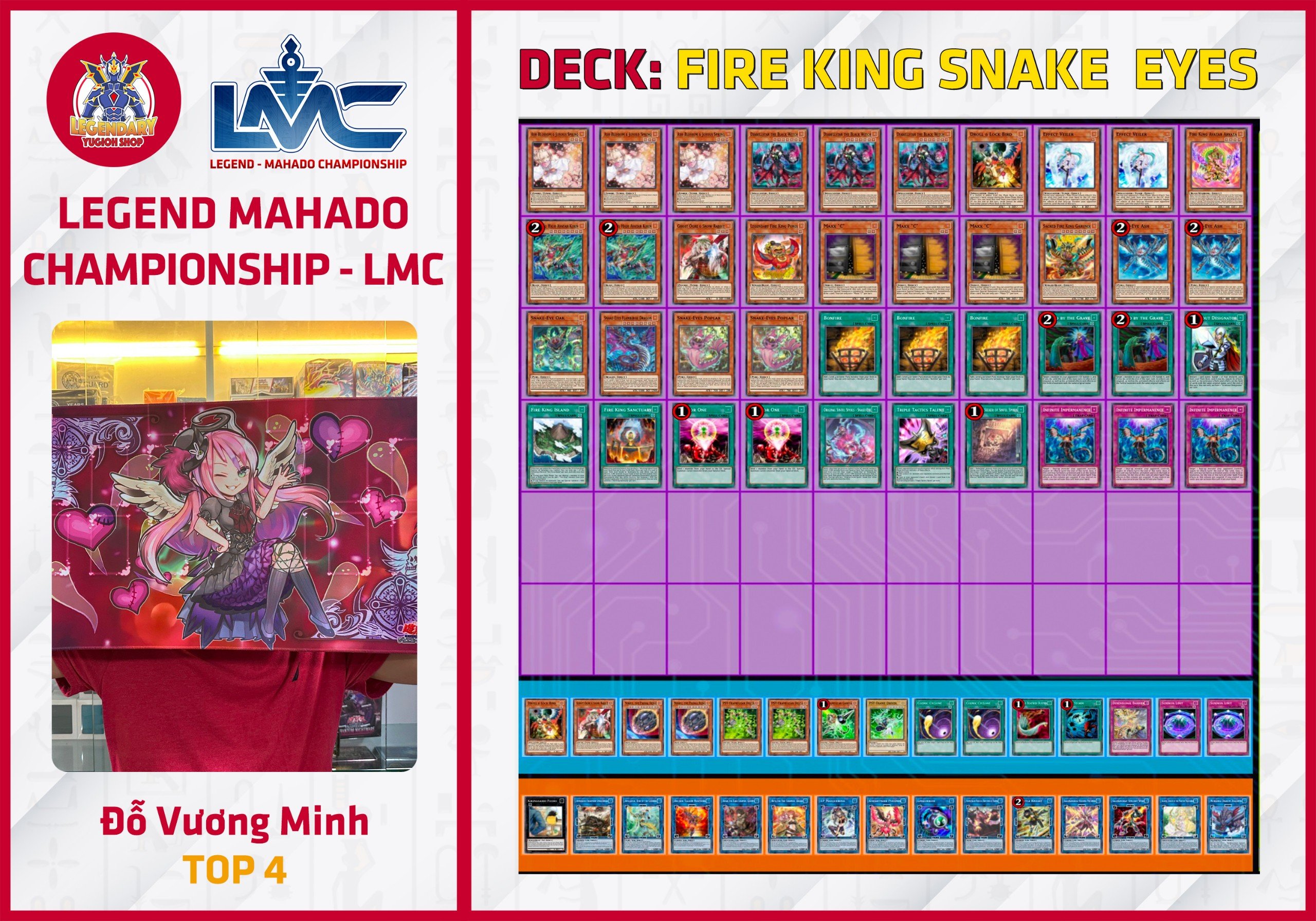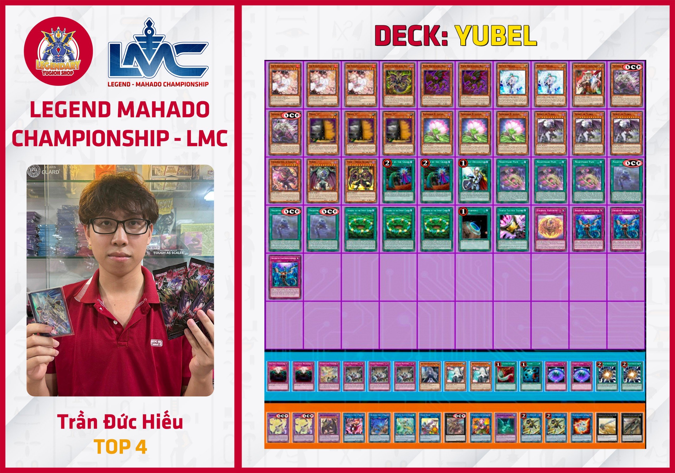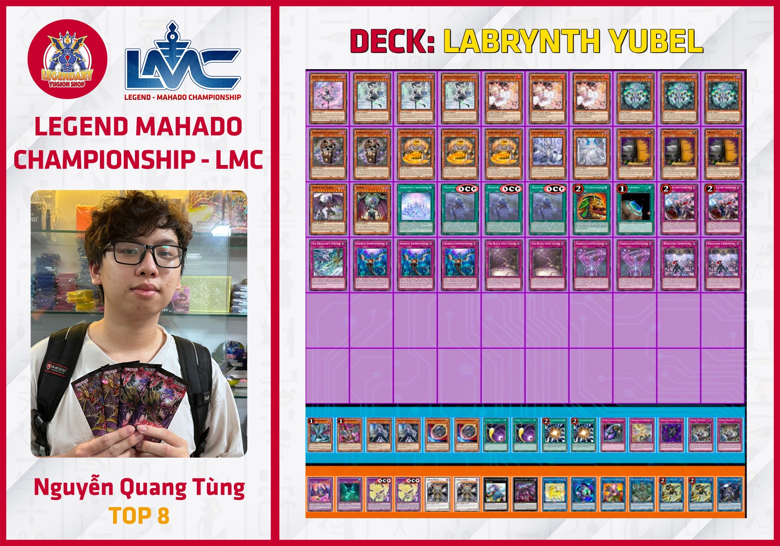 Giải đấu Legend - Mahado Championship (LMC) đầu tiên, đánh dấu sự kết hợp của 2 cửa hàng Legendary Yugioh Shop và Mahado Game Store, đã diễn ra thành công tốt đẹp vào Chủ Nhật ngày 21/04 vừa qua. Hệ thống giải đấu LMC là hệ thống thi đấu Ranking có định hướng phát triển theo format Asian English (AE) đang được Konami tiến hành áp dụng cho các nước Đông Nam Á. Để hưởng ứng phong trào cũng như để chuẩn bị tốt cho format AE, hệ thống LMC - tuy vẫn tạm thời sử dụng format OCG để thi đấu - đã và đang áp dụng nhiều ưu đãi lớn cho những người chơi sử dụng card AE do Konami phát hành.