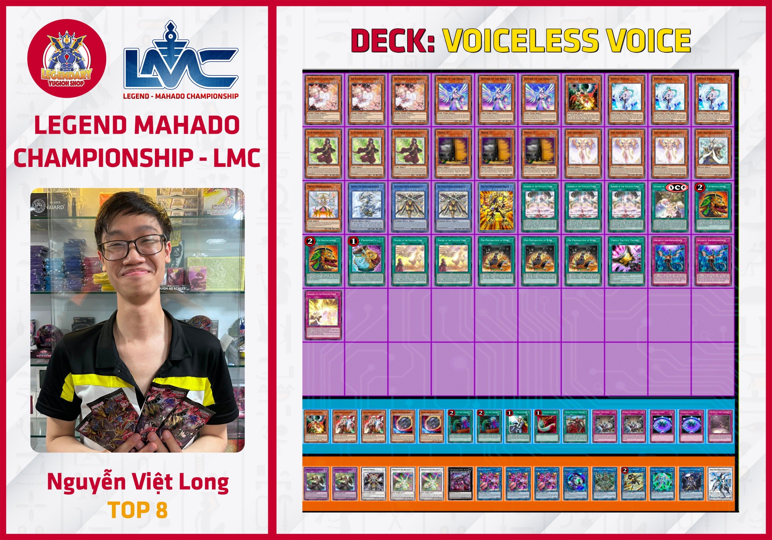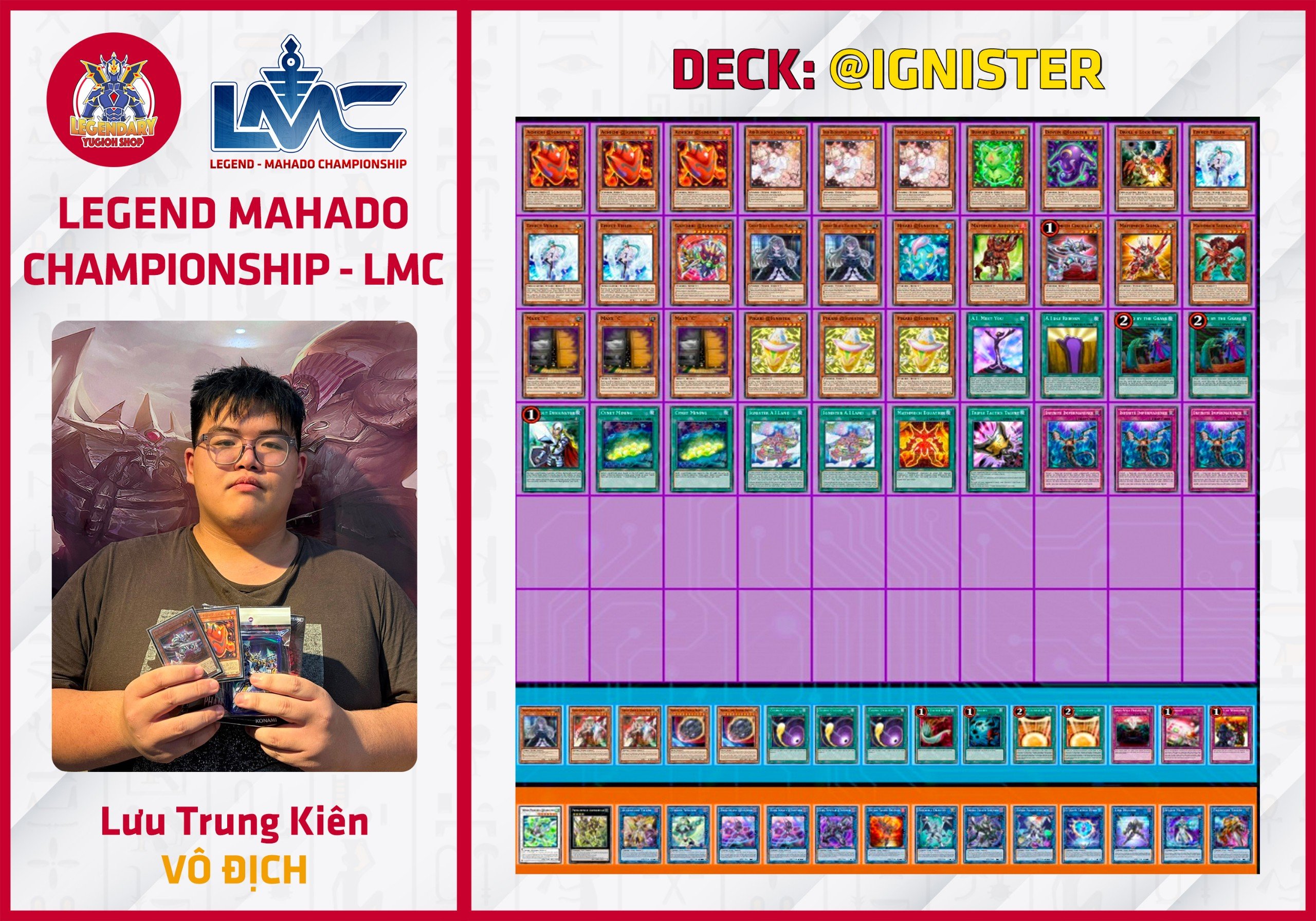 Đặc điểm của format OCG là sự đa dạng trong meta nên những Deck rogue luôn biết tạo điểm nhấn, đặc biệt là Cyberse – một Deck được cho là đã bị hit rất nhiều nhưng được hẳn 3 bài thủ sử dụng trong giải đấu lần này !!! Nhà vô địch Lưu Trung Kiên cũng sử dụng 1 biến thể đặc biệt của Deck: @Ignister.