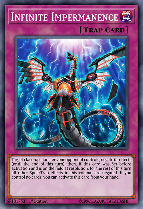 Infinite Impermanence: Tương tự như Ash Blossom, là một lá bài hiệu quả để ngăn chặn các combo của đối thủ với khả năng vô hiệu hoá Effect.