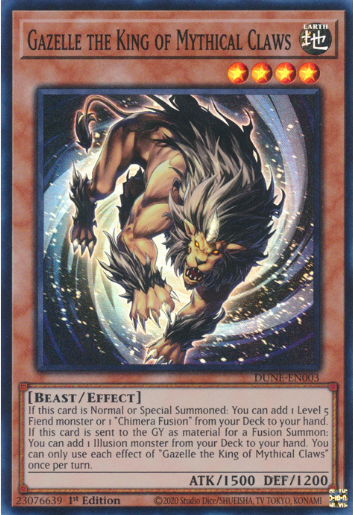 Gazelle the King of Mythical Claws khi được triệu hồi sẽ có hiệu ứng tìm kiếm một level 5 fiend ví dụ Big-Winged Berfomet hoặc Chimrera Fusion lên tay. Nếu được gửi xuống mộ thông qua việc làm nguyên liệu Fusion thì nó sẽ cho phép ta lấy một Illusion monster lên tay.