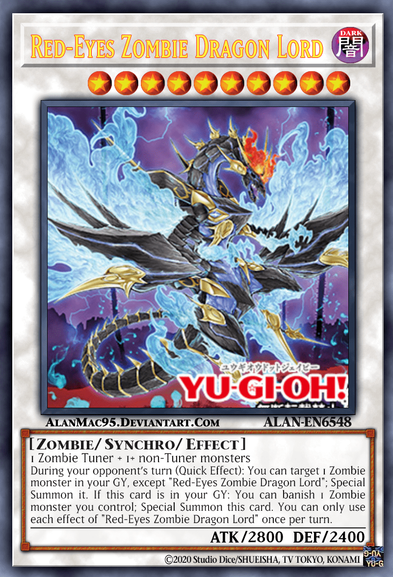 Red-eyes Zombie Dragon Lord là một quái thú Synchro level 10, với nguyên liệu triệu hồi dễ dàng, là một sự bổ sung chất lượng cho các Archetype Zombie. Trong lượt của đối thủ, bằng một Quick-Effect, người chơi có thể Triệu hồi Đặc biệt lại một quái thú Zombie từ mộ, trừ một copy khác của chính nó. Khả năng còn lại sẽ được kích hoạt khi nó ở dưới mộ, bằng cách banish 1 quái thú Zombie ở trên sân, người chơi có thể Triệu hồi Đặc biệt lại quái thú này lên sân. Trông có vẻ quái thú này không làm được gì nhiều, nhưng khả năng triệu hồi đặc biệt lại những quái thú Zombie mạnh mẽ ở dưới mộ là không nên xem thường, nhất là khi người chơi có thể hồi sinh lại những Boss Monster như Doomking Balerdroch. Đặc biệt hơn, nếu có Zombie World trên sân, thì người chơi có thể hồi sinh lại bất kì quái thú nào ở dưới mộ của mình!