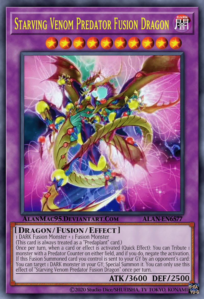 Nếu như người chơi đang tìm kiếm thêm một Target nữa cho Super Polymerization, đặc biệt trong các kèo đấu với Branded Despia, thì Starving Venom Predapower Fusion Dragon là lựa chọn dành cho họ, bên cạnh những Target cũ như Mudragon of the Swamp hay Predaplant Dragostapelia. Quái thú 3600ATK này yêu cầu một quái thú Fusion hệ Dark và một quái thú Fusion khác làm nguyên liệu triệu hồi, khá hữu dụng khi kết hợp với Superpoly, tuy rằng khi được triệu hồi thông qua phương thức này thì khả năng đầu tiên của nó gần như sẽ trở nên vô dụng, do nó không được đi kèm với các quái thú có khả năng đặt Predator Counter khác. Ngoài ra, khi bị gửi xuống mộ bởi đối phương, quái thú này có thể hồi sinh lại một quái thú hệ Dark bất kì, kể cả chính nó, tuy nhiên khả năng này bị giới hạn 1 lần mỗi lượt để tránh việc người chơi liên tục hồi sinh lại chính lá bài này. Nhìn chung, đây là một lá bài ổn để kết hợp với Super Polymerization, một lá bài đang nổi lên rất mạnh trong meta hiện tại.